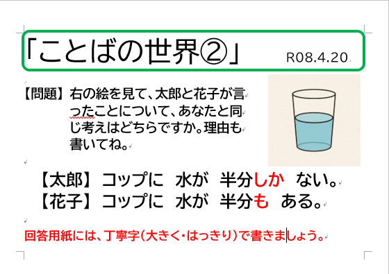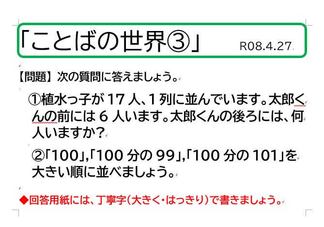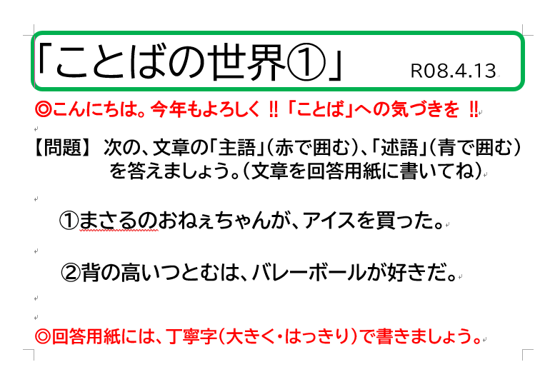 最後に、今年度も『みんなだいすき「ことばの世界」』を行っていきたいと思います。ご家庭での話題のひとつになればと考えています。あと、参加者が昨年よりも増えることを願っています。どうぞ、よろしくお願いいたします。みんなが考えた問題があれば、教えてください。"Super ことば Kids" 目指して、がんばりましょう!!