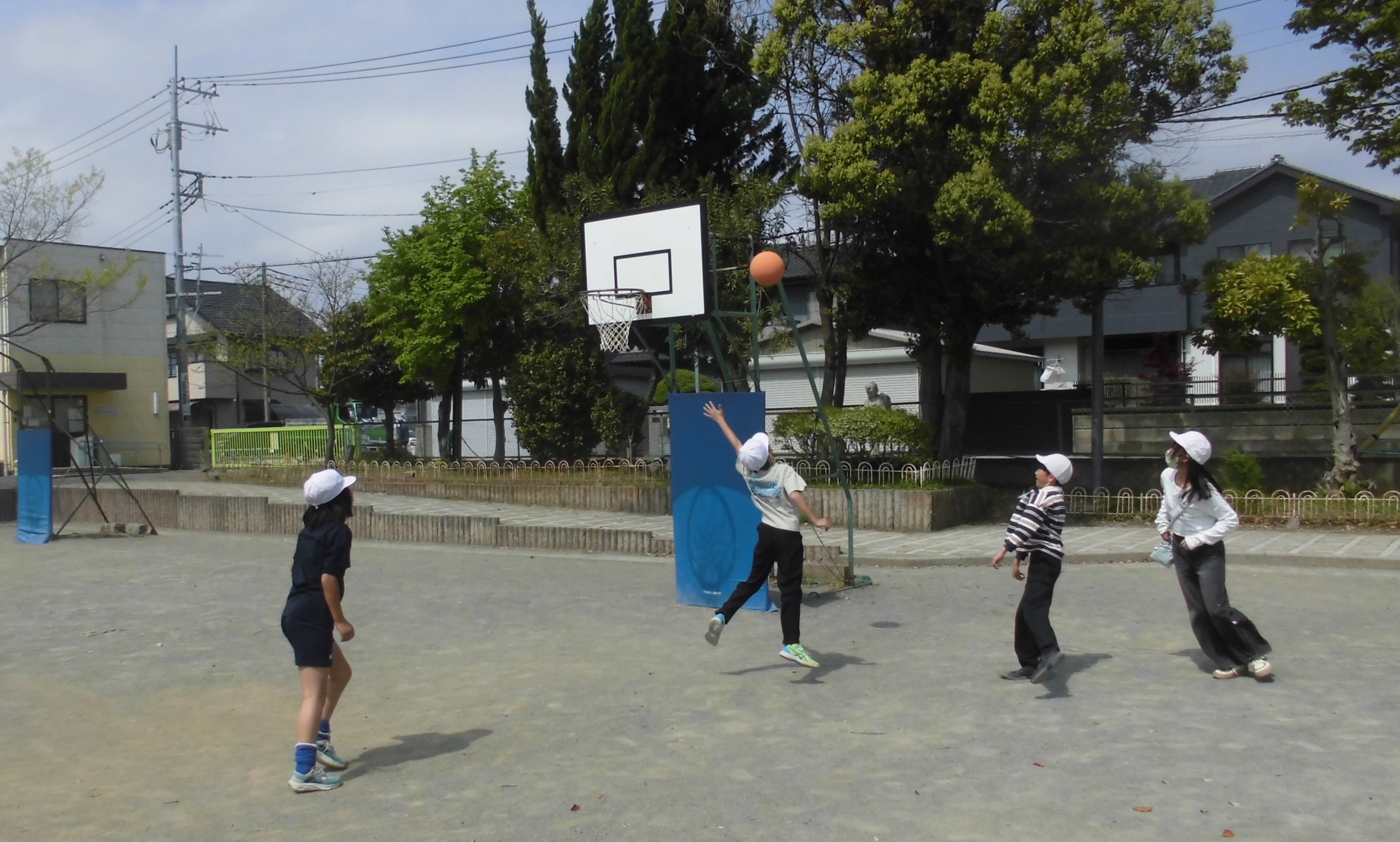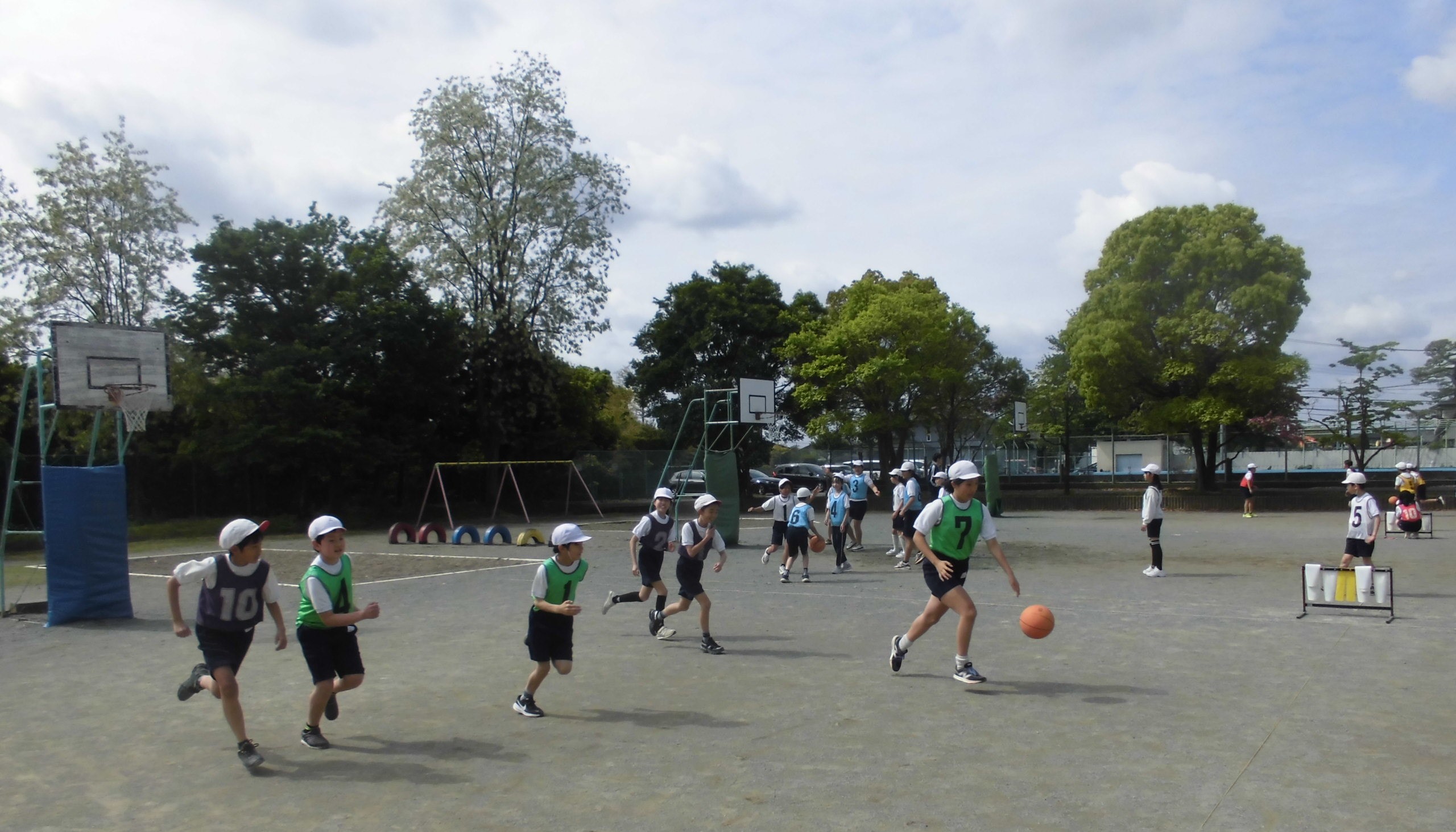 校庭では、6年生が、体育のバスケットボールに取り組んでいました。声をかけ合い、パスを出し合いながら頭脳を使ったプレーができていました。かっこよかったです。