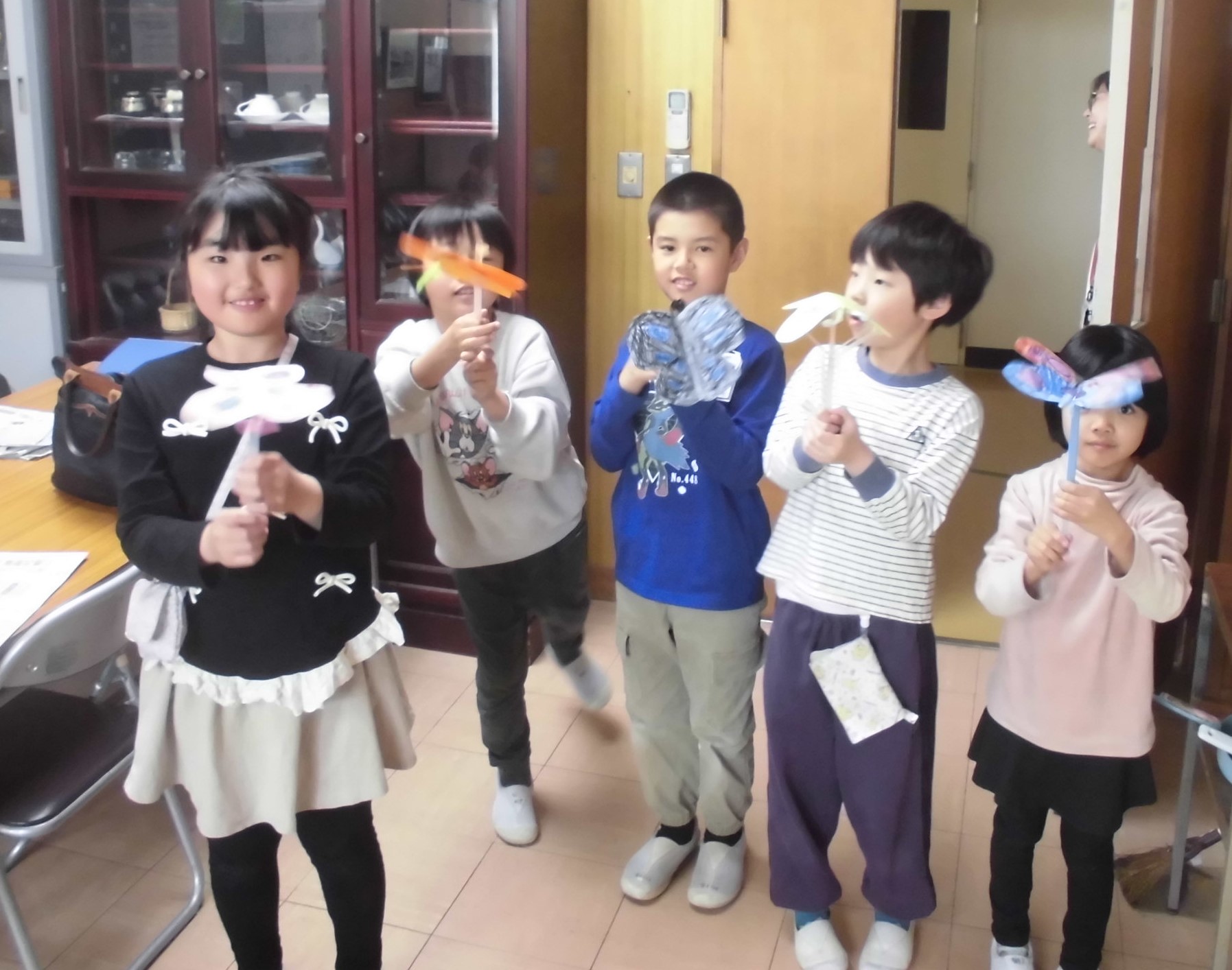 校長室に、えがお学級の子たちが図工で「パタパタちょうちょ」をつくって見せに来てくれました。みんな上手に作ってあって本物のチョウのようでした。