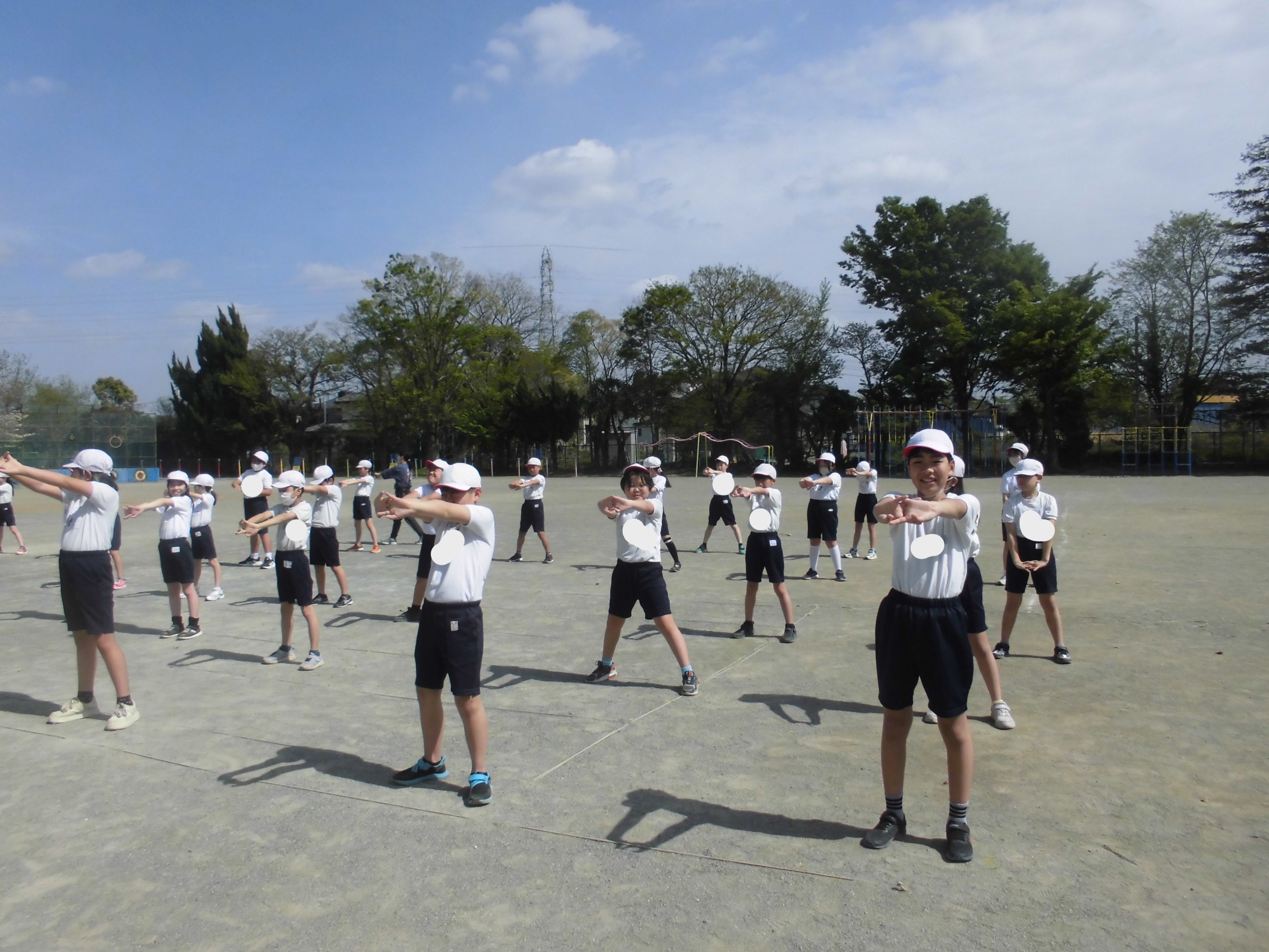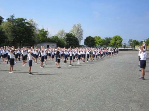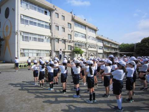 さて、今朝は「体育朝会」を行いました。今年度初めての運動朝会では整列と笛の合図について確認し、植水体操を行いました。運動会でも行う体操なのでしっかり覚えましょう。