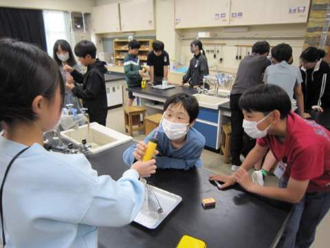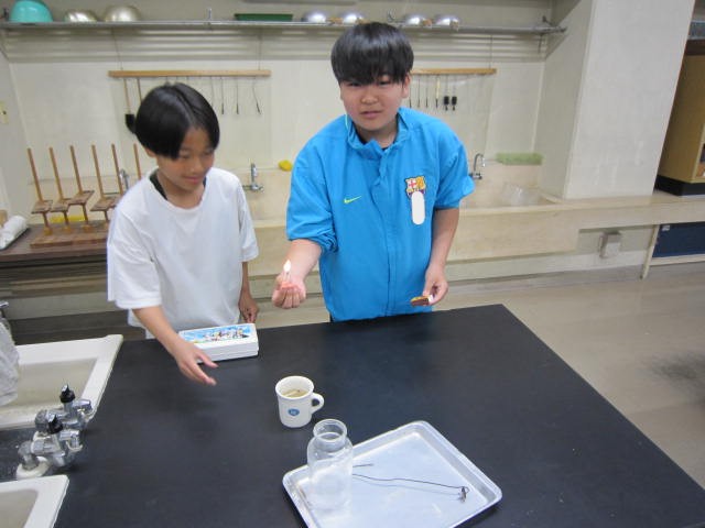 6年生は、理科で空気中の成分で何が燃えるために必要かを調べる実験を行いました。こちらも初めての「水上置換」に取り組みました。6年生の学習内容と1年生の学習内容のギャップがすごいですね。1年生のこれからの成長が楽しみです。