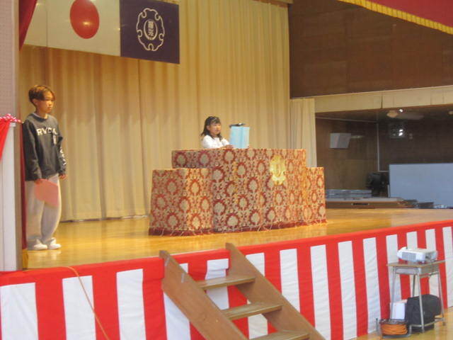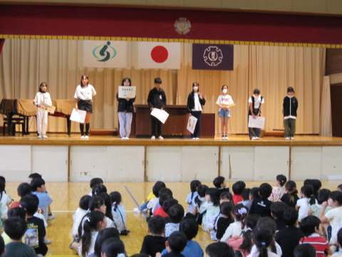今日は朝会で児童朝会があり、新しい委員長が1年間の活動について全校児童の前で報告しました。5・6年生のみなさんしっかり頑張ってください!