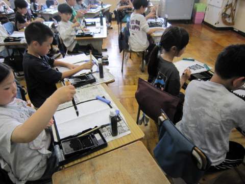 4年生は今年度初めての習字に取り組んでいました。横に線を引くときに、「トン・スー・ピタ!」と繰り返しながら、丁寧な線が引けるように繰り返し練習していました。素敵な文字が書けるように頑張ってください!