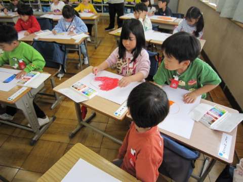 1年生は図工で「すきなものいっぱい」に取り組み、好きなものをクレヨンで画用紙いっぱいにかいていました。机の上にはイチゴやらオレンジやらゲーム機やら乗り物やらそれぞれの思いがいっぱいにあふれた素敵な作品が出来上がっていました。できた時に周りの先生に見て見て~と必死にアピールする子、黙々と自分の絵に取り組む子、じっくり考えて自分のかきたいものをイメージする子がいて、同じ図工でも一人ひとり取り組み方が違うのも興味深いですね。