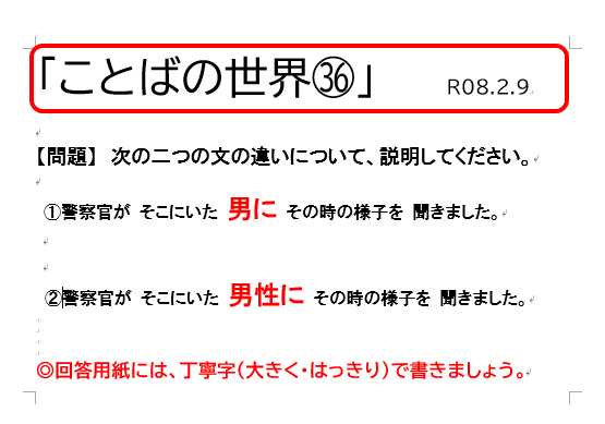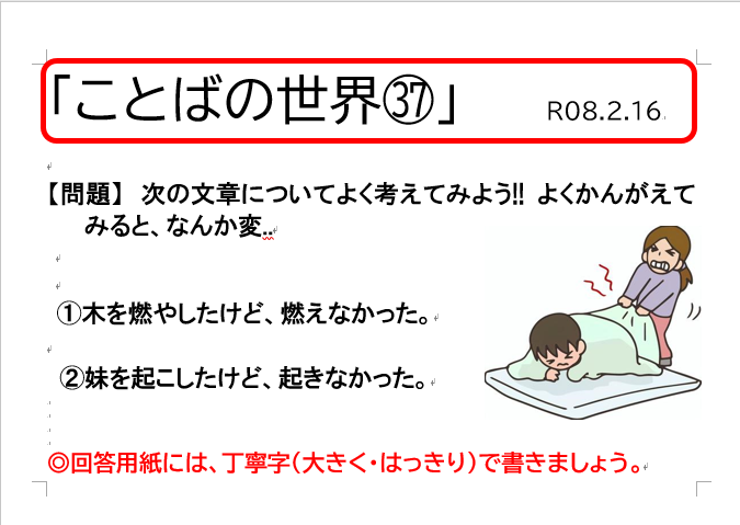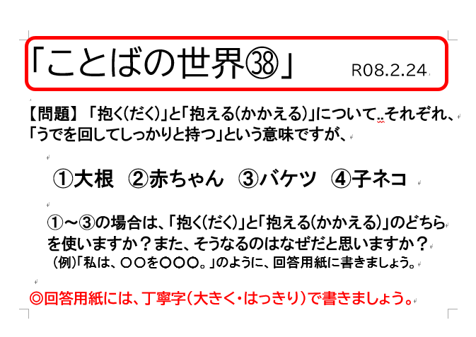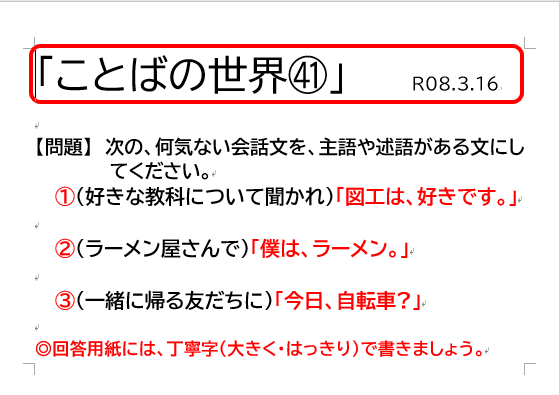 今回で、今年度の「ことばの世界」(みんな大好き)は終了となります。自分たちが気づいたら話すことができていた「母語(日本語)」について、子どもたちの新たな気づきや知識になればと思い(ご家庭での話題のひとつになればとの願いも)1年間続けさせていただきました。また、気づきや知識が蓄積されていくことで、普段の授業や学習にもよい影響が及ぼされると信じています。また、次年度も..ありがとうございました。