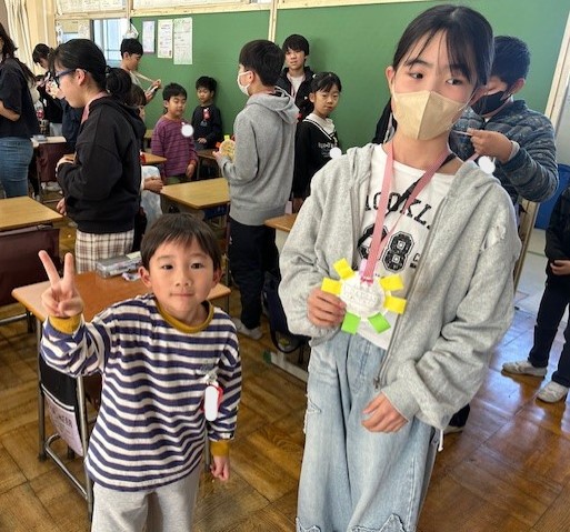 そしていつもなかなか紹介する機会がなかったクラブ活動についていくつかのクラブを回りましたのでご紹介します。ネットスポーツクラブでは、今週はバスケットとハンドボールを行っていました。バドミントンを行うときもあるようです。4~6年生が交流しながらゲームに取り組んでいました。家庭科クラブでは、マフラーを編んでいました。いまの時期にピッタリですね。とても上手にできている子もいてとても感心しました。大切に使いたい!?ですね。室内レククラブでは、ジェンガで遊んでいました。この寿司ジェンガは寿司の中に罰ゲームが入っているようです。恐ろしい…早速スクワットをしている子がいました。外遊びクラブはクラブ紹介のためのビデオ撮影を行っていました。3~5年生が次のクラブを決める参考にしますからいい映像にしてくださいね!