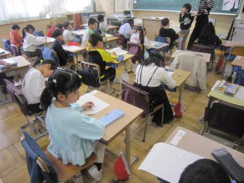 1年生は、国語の「みぶりでつたえる」を学習しました。「うれしいときはばんざいをします。」「おこっているときはうでぐみをします。」というように感情が身振りで伝えれていることを文章にするのですが、なかなか難しい…。1年生頑張れ! 2年生は「まちたんけん」の発表を行っていました。自分が見てきたものや感じたことをみんなに伝え、地域にはたくさんの人々が関わっていることを学びました。3年生は、「おなか元気教室」を体育館で行いました。体育館にヤクルトの講師をお招きして、お腹の中から体調を整える話を分かりやすくしてくださいました。