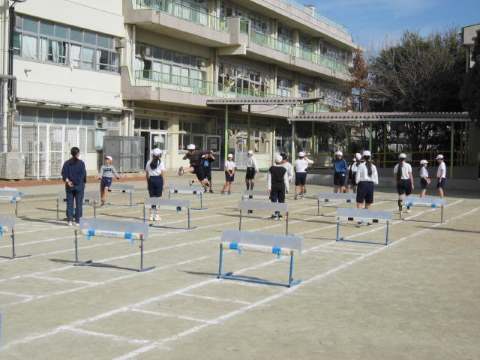 校庭では、4年生が「ハードル走」の授業に取り組んでいました。いかに、高く跳ぶことなく、むしろ、またぐように走りぬけるにはどうすればよいか考えながら走っていました。