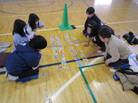 そしていつもなかなか紹介する機会がなかったクラブ活動についていくつかのクラブを回りましたのでご紹介します。ネットスポーツクラブでは、今週はバスケットとハンドボールを行っていました。バドミントンを行うときもあるようです。4~6年生が交流しながらゲームに取り組んでいました。家庭科クラブでは、マフラーを編んでいました。いまの時期にピッタリですね。とても上手にできている子もいてとても感心しました。大切に使いたい!?ですね。室内レククラブでは、ジェンガで遊んでいました。この寿司ジェンガは寿司の中に罰ゲームが入っているようです。恐ろしい…早速スクワットをしている子がいました。外遊びクラブはクラブ紹介のためのビデオ撮影を行っていました。3~5年生が次のクラブを決める参考にしますからいい映像にしてくださいね!