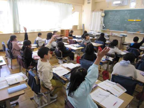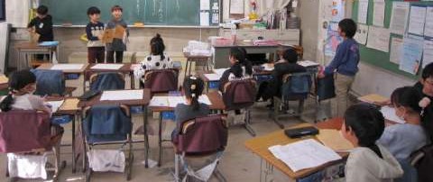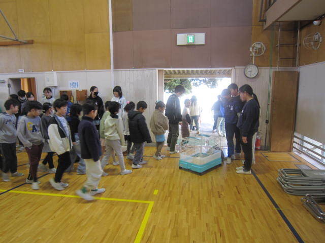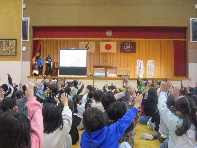 1年生は、国語の「みぶりでつたえる」を学習しました。「うれしいときはばんざいをします。」「おこっているときはうでぐみをします。」というように感情が身振りで伝えれていることを文章にするのですが、なかなか難しい…。1年生頑張れ! 2年生は「まちたんけん」の発表を行っていました。自分が見てきたものや感じたことをみんなに伝え、地域にはたくさんの人々が関わっていることを学びました。3年生は、「おなか元気教室」を体育館で行いました。体育館にヤクルトの講師をお招きして、お腹の中から体調を整える話を分かりやすくしてくださいました。