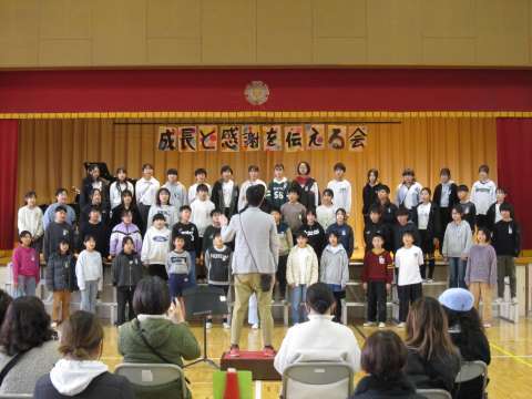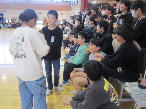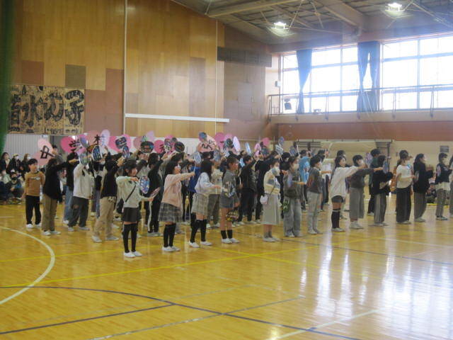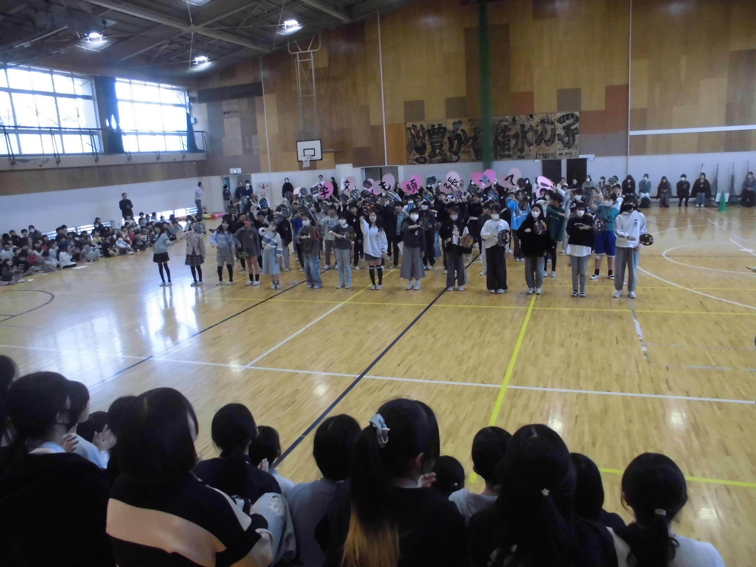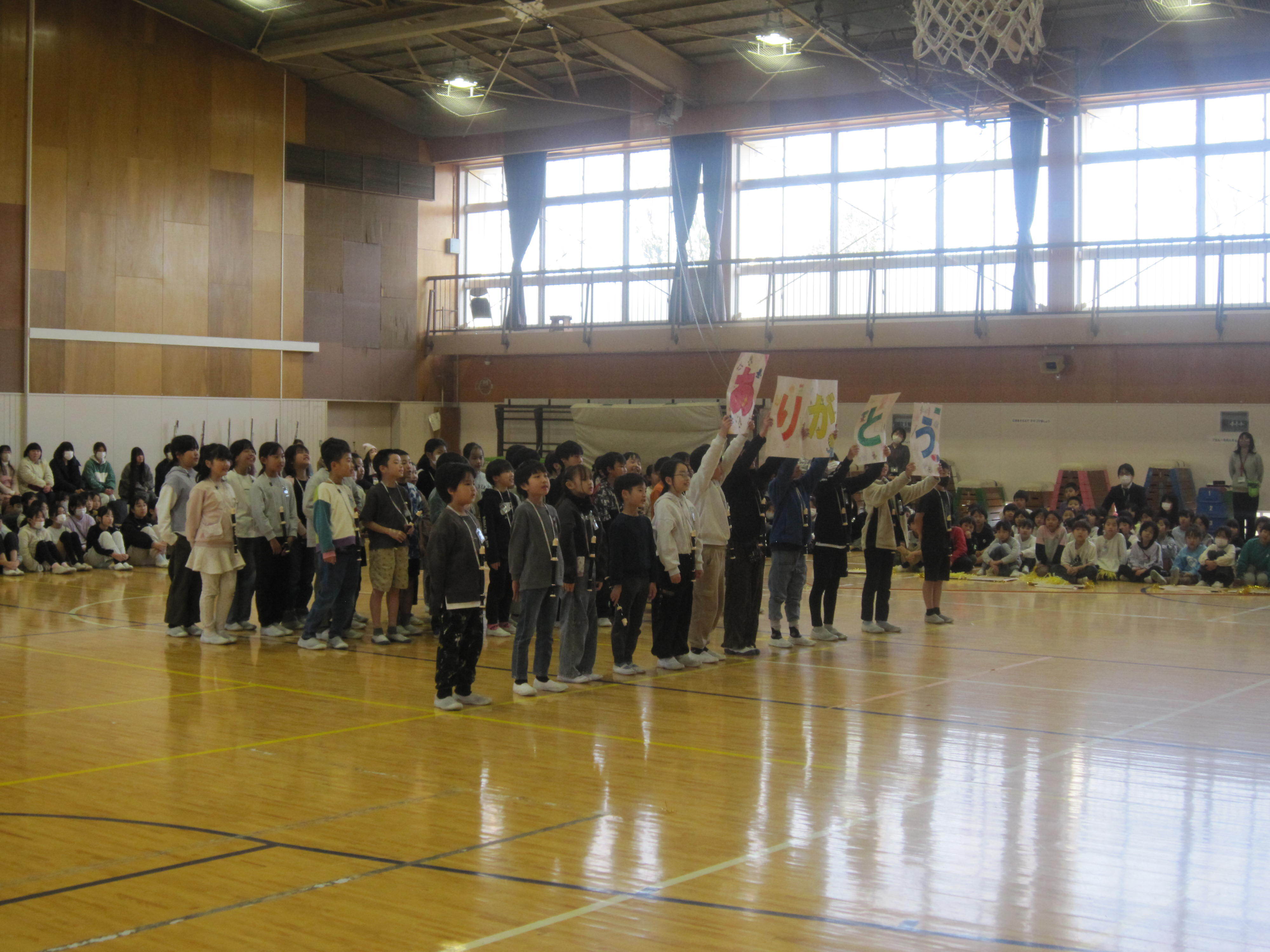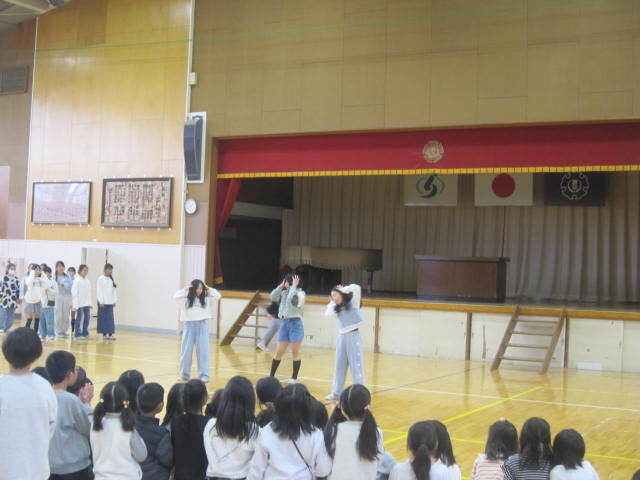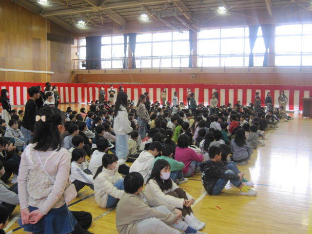 5時間目の時間に行われました。今年度は6年生の保護者だけご参観いただきました。1年生から5年生までが工夫を凝らした出し物をして6年生に感謝を伝えました。2年生のマツケンサンバの「オレ!」が「お礼」なのは面白かったです。その他の学年も、6年生の「推しうちわ」を作ったり、「カリスマックス」を踊ってクイズをしたり、リコーダーの出し物をしたりと見どころたくさんでした。最後に6年生から歌の「お返し」がありました。みんな食い入るように、静かに見ていました。6年生が学校で過ごすのはあと「12日」です。