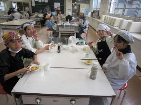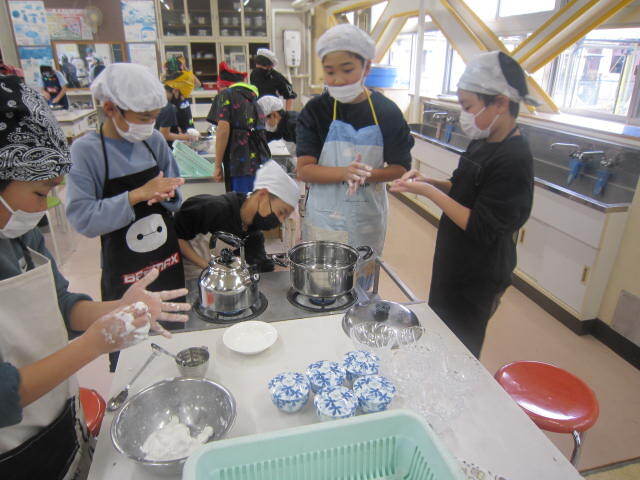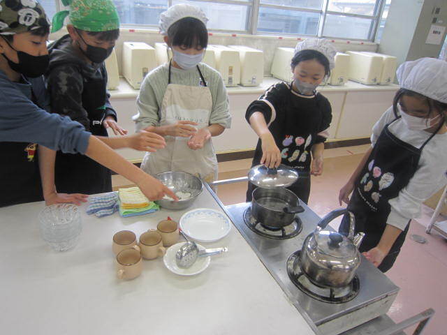 5・6時間目には5年生が白玉を作っていました。粉から団子をつくっていくのはなかなか経験できないことではないでしょうか。水の調整に苦労しながらがんばってこねていました。きっとおいしい白玉ができたことでしょう!