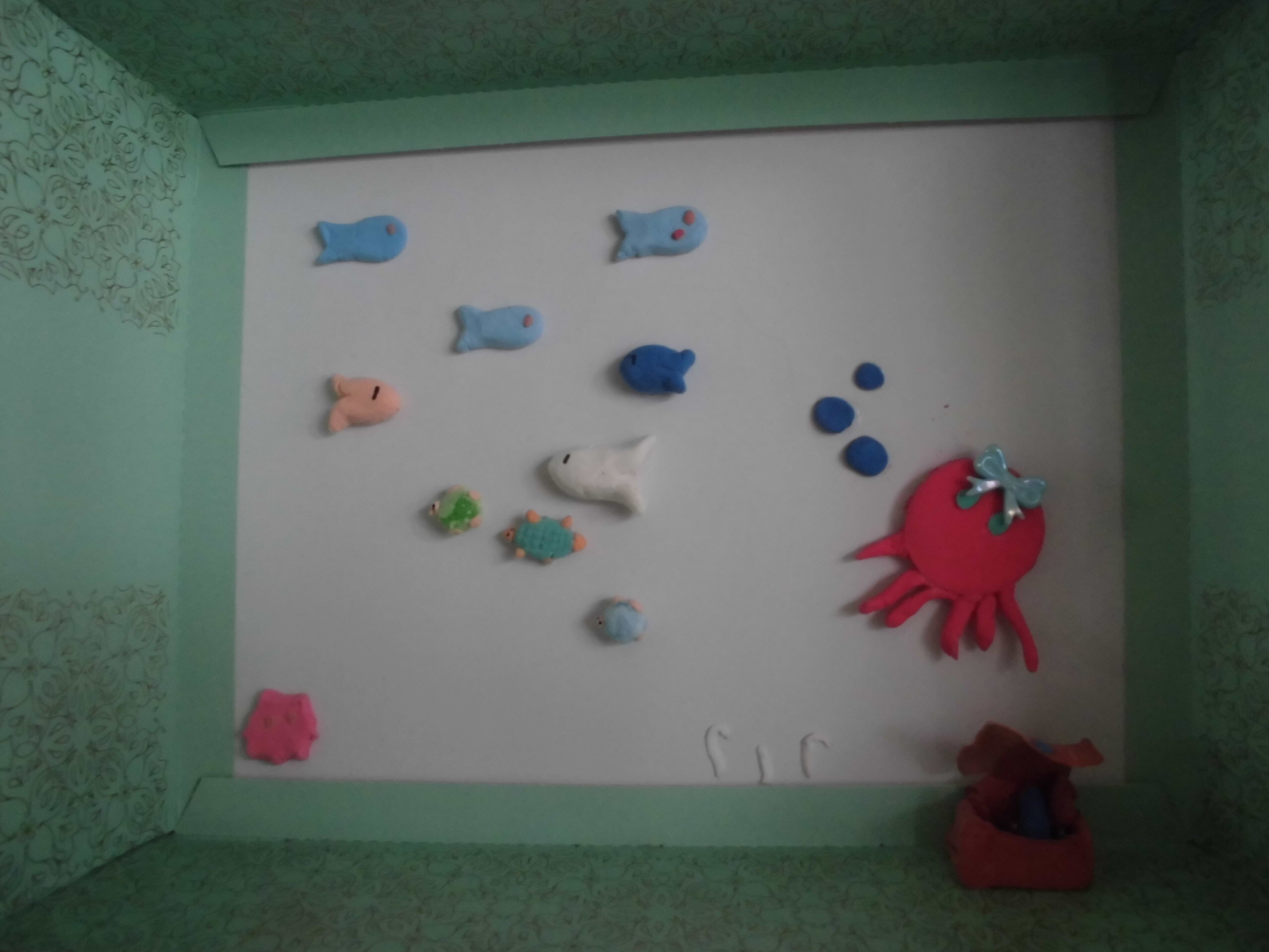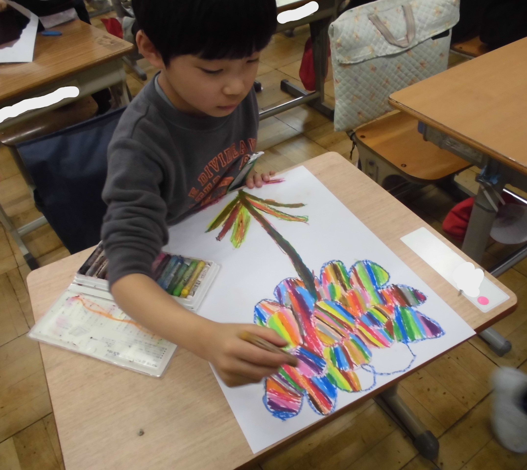 1年生は、図工に取り組んでおり、クレヨンで丁寧な色塗りをする子どもたちの姿に感心させられました。「ひとつひとつ丁寧に」を心掛けてください。3年生の教室には、図工の時間に作製した作品が飾られていました。箱の中に「海の中」を表現したもので、こちらも「ひとつひとつ丁寧に」が心掛けられた作品でした。すばらしい!!