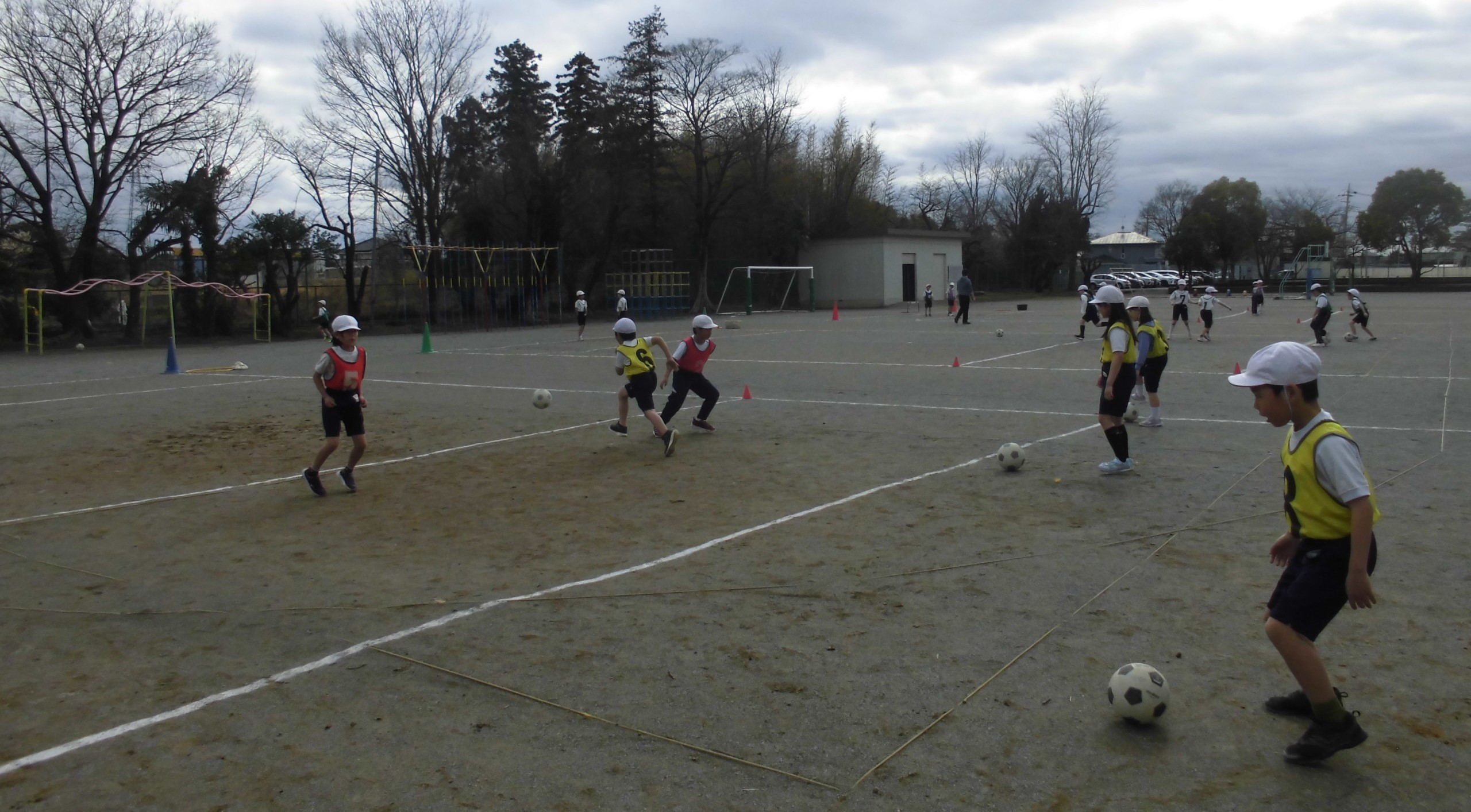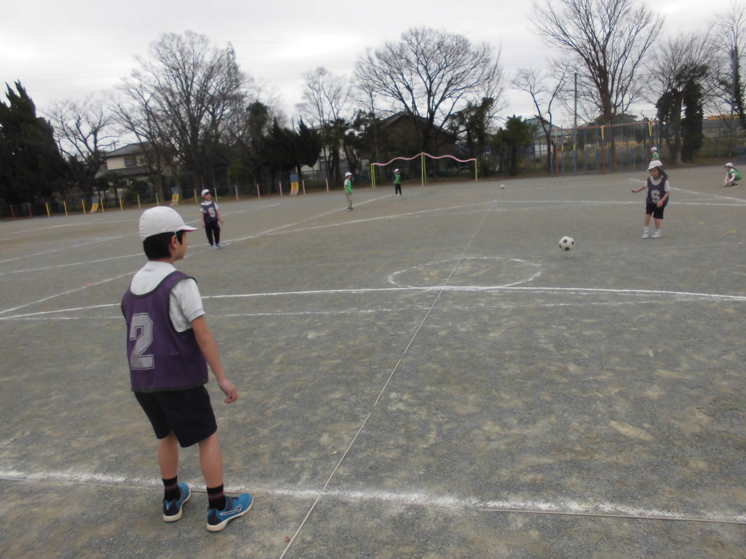 2年生は、寒い中「サッカー」に取り組んでいました。相手がとりやすいようパスを出していました。