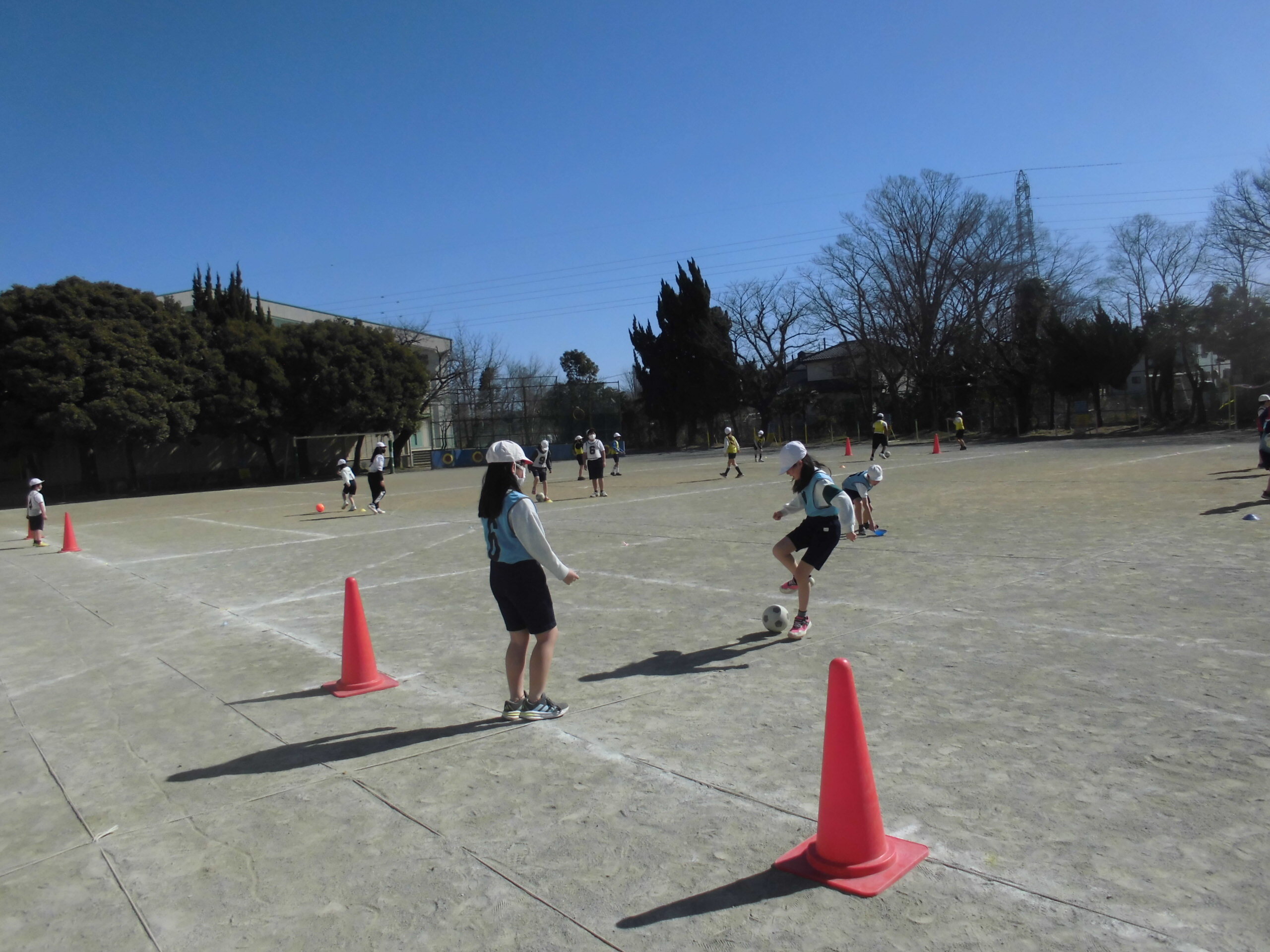 2年生が、校庭で体育「サッカー」に取り組んでいました。チーム内で声をかけ合いながら、ドリブルドリブル..そのあとは、稲妻シュート!! ですね。チーム内で協力しながら、試合がんばってください。