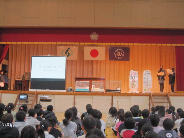今日は朝から晴れて気持ちのよい天気となりました。今日は朝から、飼育委員会によるうさぎのお別れ会がありました。うさぎは近年の気候の厳しさによって屋外で1年中飼うことが難しくなっており、やむなく学校もうさぎの飼育をあきらめることとなりました。(3羽のうち、1羽がまだ引き取り手が見つかっていません。保護者だけでなく、お知り合いの方でも構いませんので、引き取りにご興味のある方は植水小までご連絡ください。)
