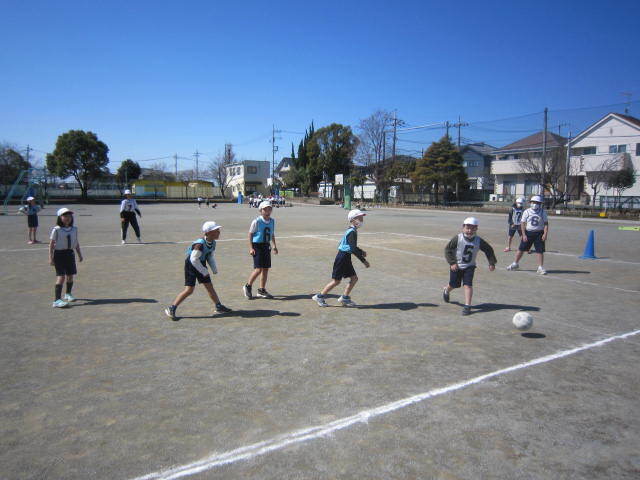 2年生は、大人数で声を出し合いながらサッカーに取り組んでいました。話を聞くと、ドッチボールの日、サッカーの日があるらしいです。これからも、ボールと仲良くなるためにがんばってください。
