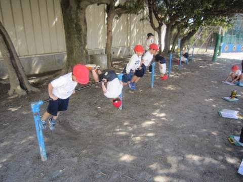 1年生は、鉄棒をしていました。自分で決めた技に取り組み、みんなの前で披露していました。これからもどんどん上達するように頑張ってください! 他に、しゃがんで、前の子の方につかまりながら「ムカデで~す!!」と言いながら、足腰を鍛えることもできました。足腰、しっかり鍛えましょう。