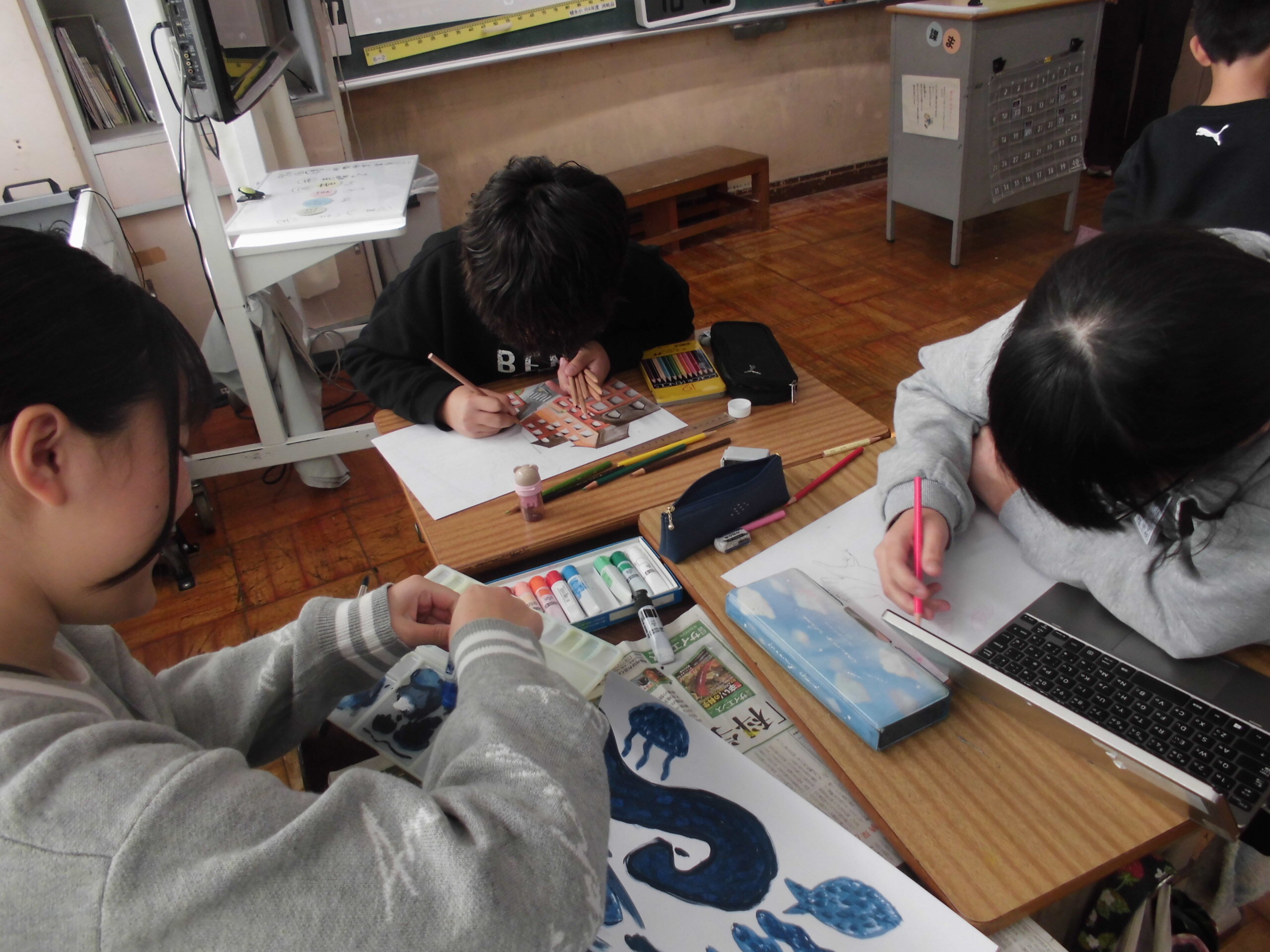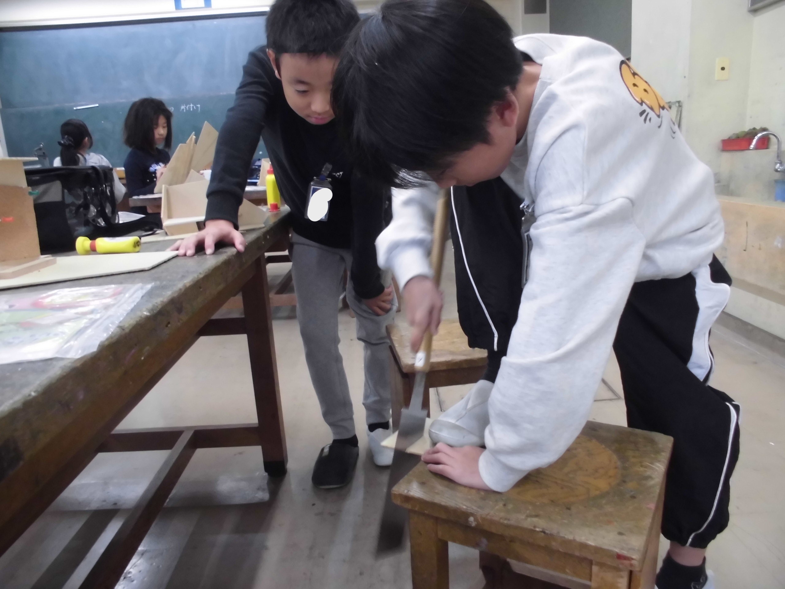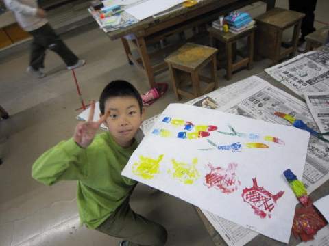 4年生は、図工の版画の色付けをしました。バレンを使って、足腰をしっかり使いながらゴシゴシすることができました。どのような作品に仕上がるか楽しみですね。目指せ、「葛飾北斎」..