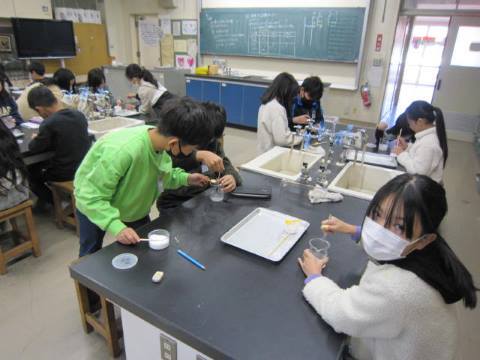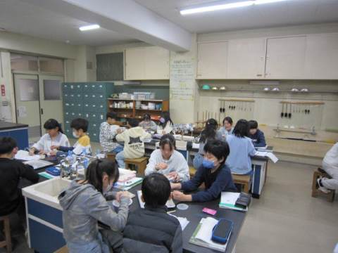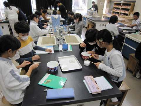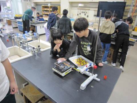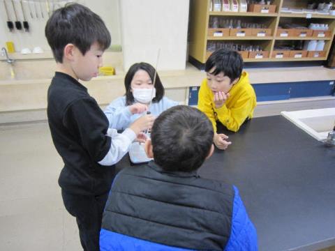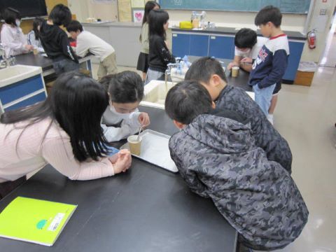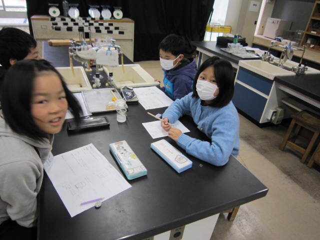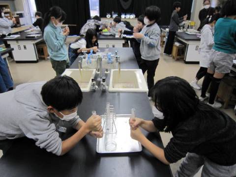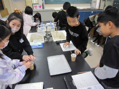 理科室では、5年生が「物のとけ方」の学習で、40℃や60℃のお湯では物のとけ方に変化があるのかを実験しました。食塩とミョウバンを溶かして結果は…。物のとけ方には違いがあるようです。みんなは諦めたくないと一生懸命ガラス棒をかき回していました。5年生へ、水のかさを測る細長いガラスの(怪獣みたいな名前の)器具は何でしょう。(テストに出ますから絶対に覚えてください。)