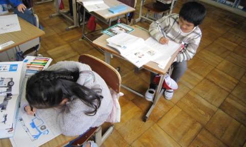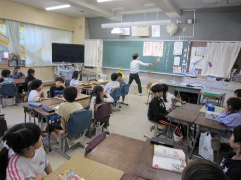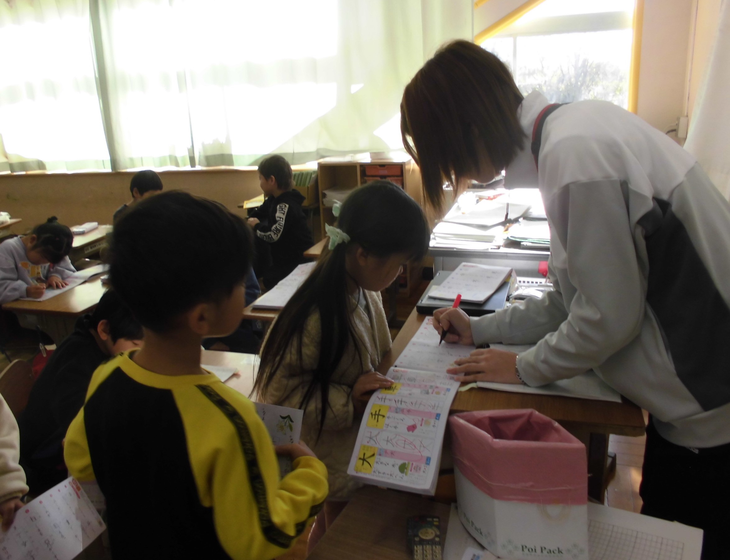 1年生の教室では、漢字練習をがんばっていました。書いた漢字を担任に持っていって、確認してもらっていました。とにかく書いて、たくさん覚えてください。