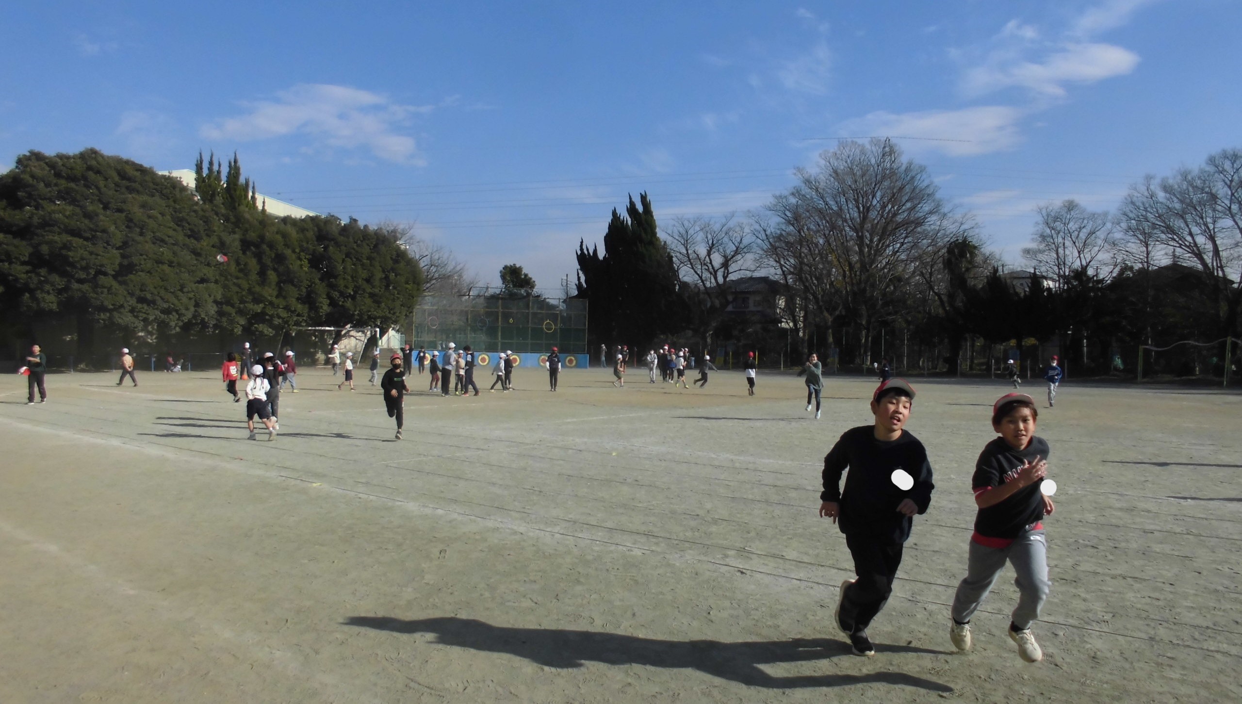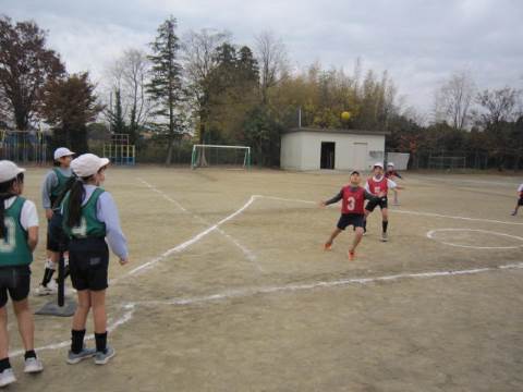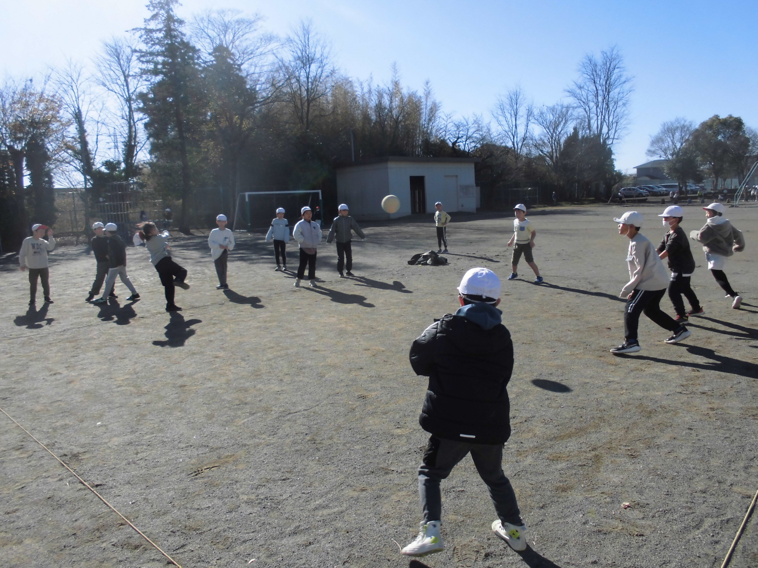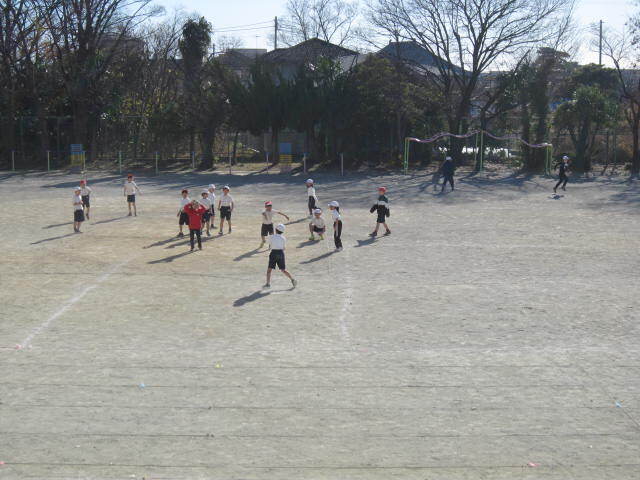 2年生は、体育で「プレゼント運びおに」をやっていました。サンタさんとそれを邪魔するオオカミということで子どもたちも真剣にプレゼントとなる玉を一生懸命相手陣地の向こうへ運んでいました。