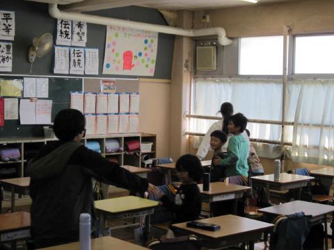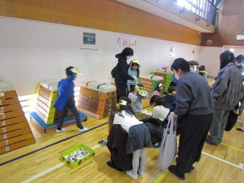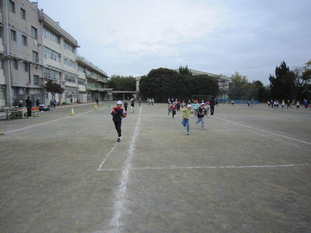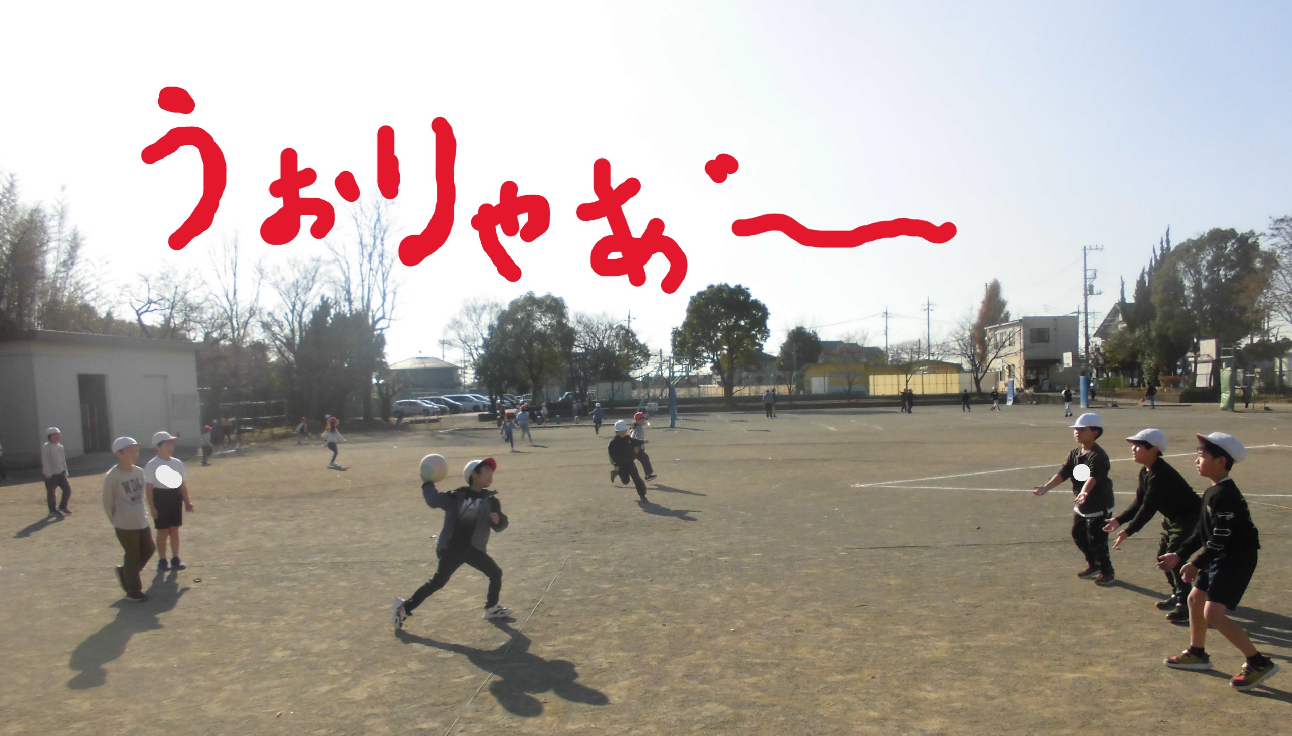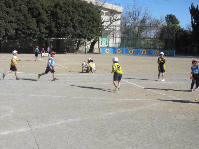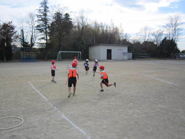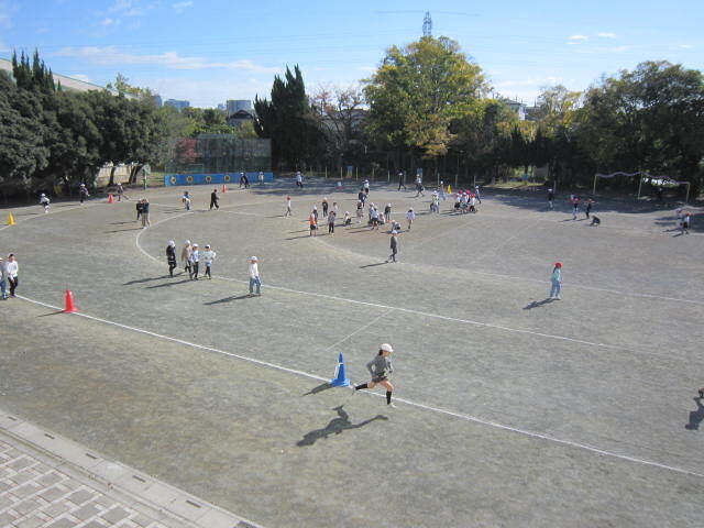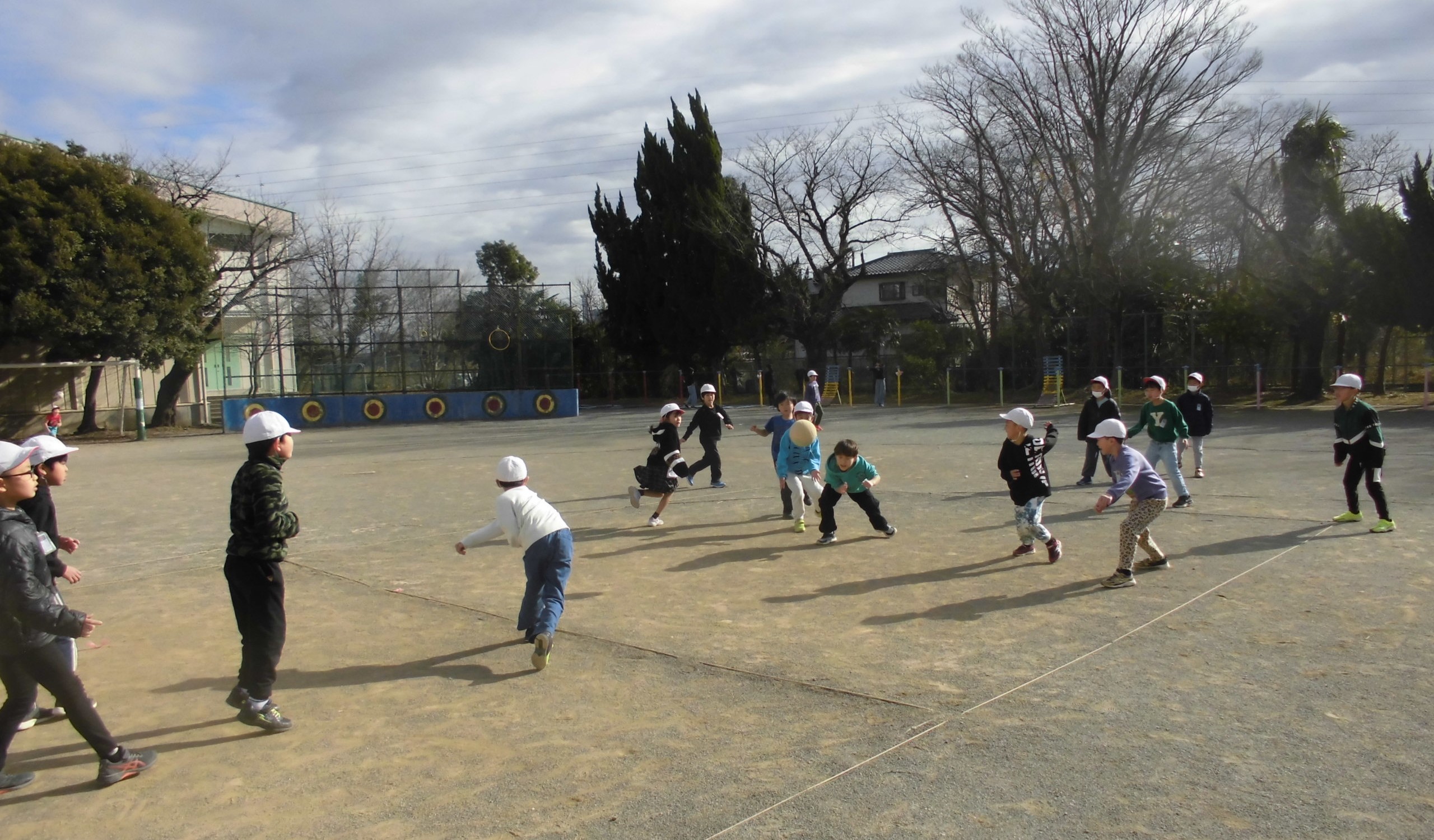 2年生は、体育で「プレゼント運びおに」をやっていました。サンタさんとそれを邪魔するオオカミということで子どもたちも真剣にプレゼントとなる玉を一生懸命相手陣地の向こうへ運んでいました。