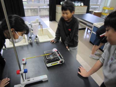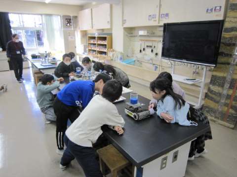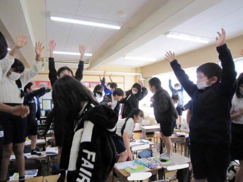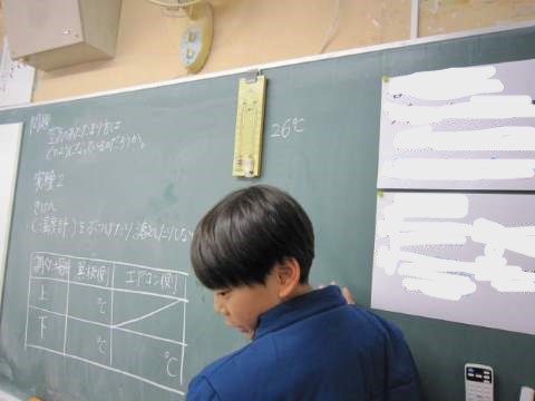 4年生は教室で「空気のあたたまり方」を学習しました。どうして教室の上と下で温度が違うのか。子どもたちは予想をもとに、空気の動き方について考えました。また、机の上に立って実際に教室の上の空気が温まっていることを確認しました。