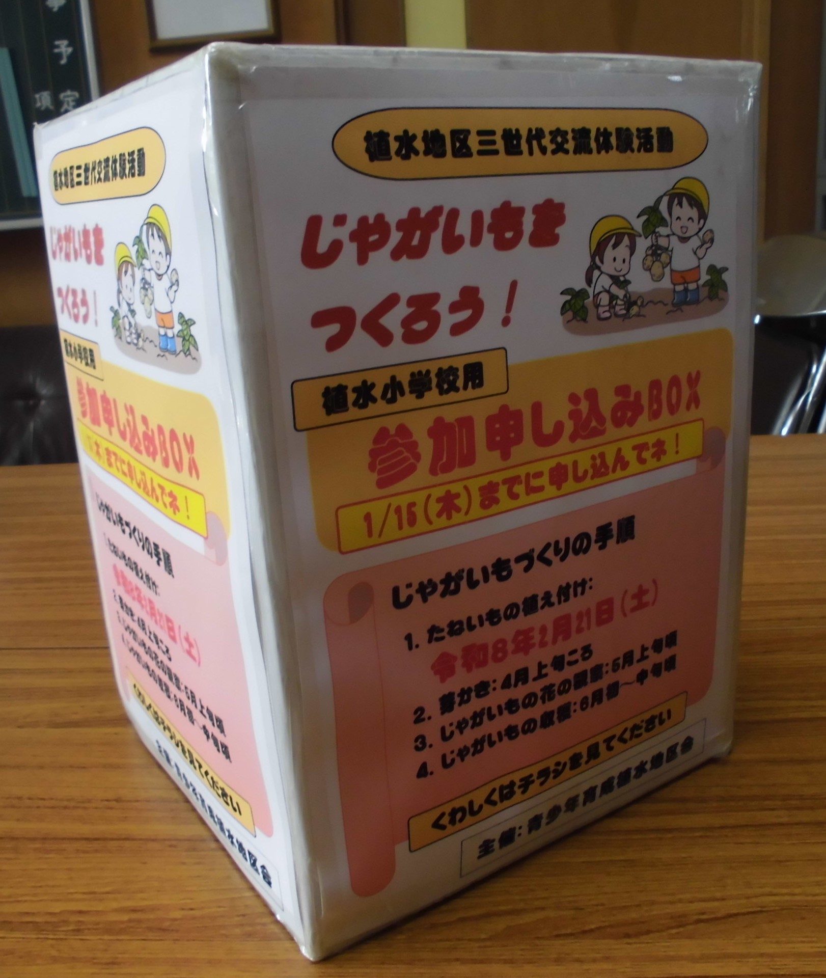 最後に、昨日HPでお知らせした「親子三世代交流体験活動 じゃがいもつくろう」参加申し込みBOXを校長室前に設置しました。よろしくお願いいたします。「じゃがたらいも、育てましょう!!」