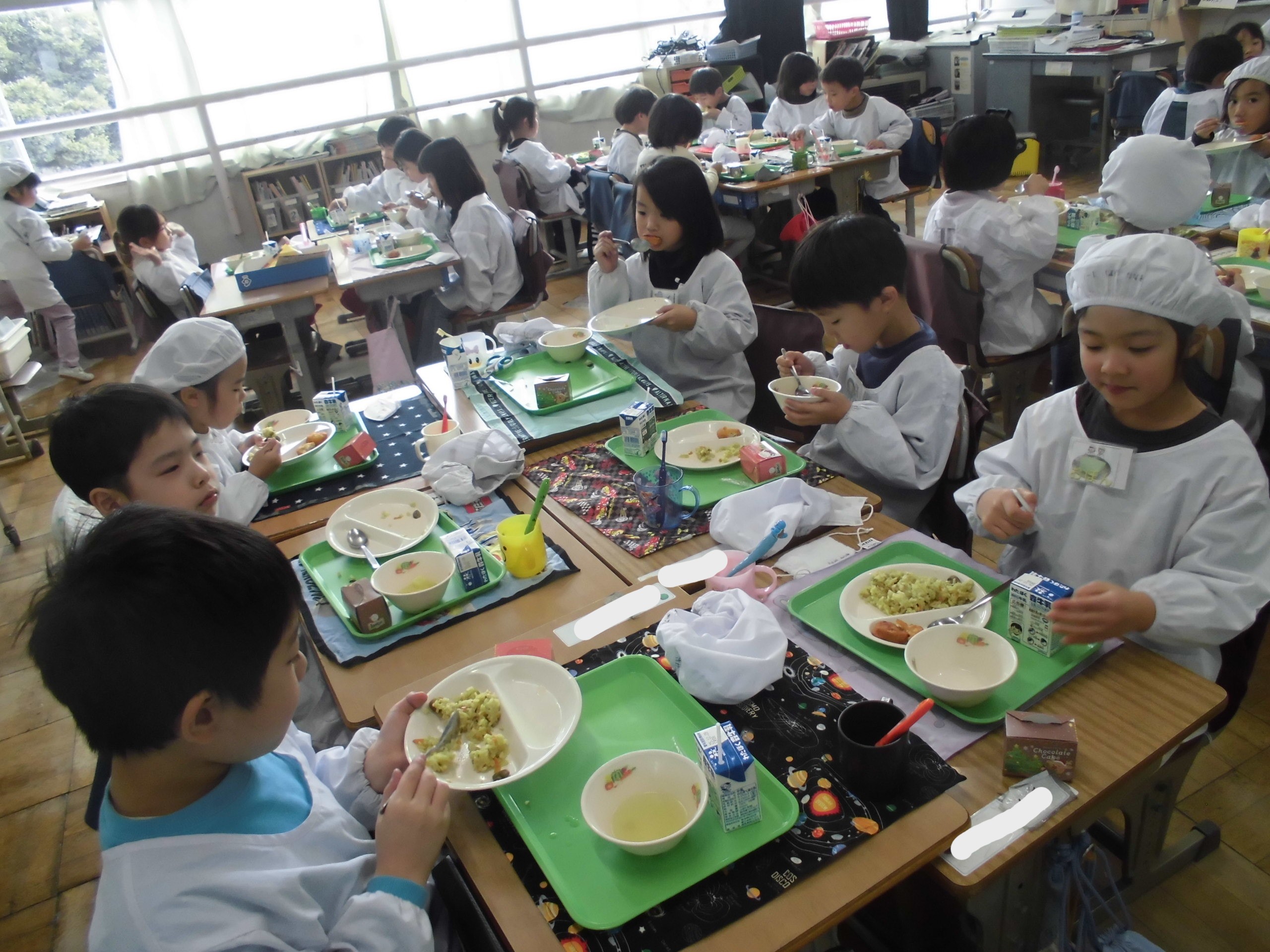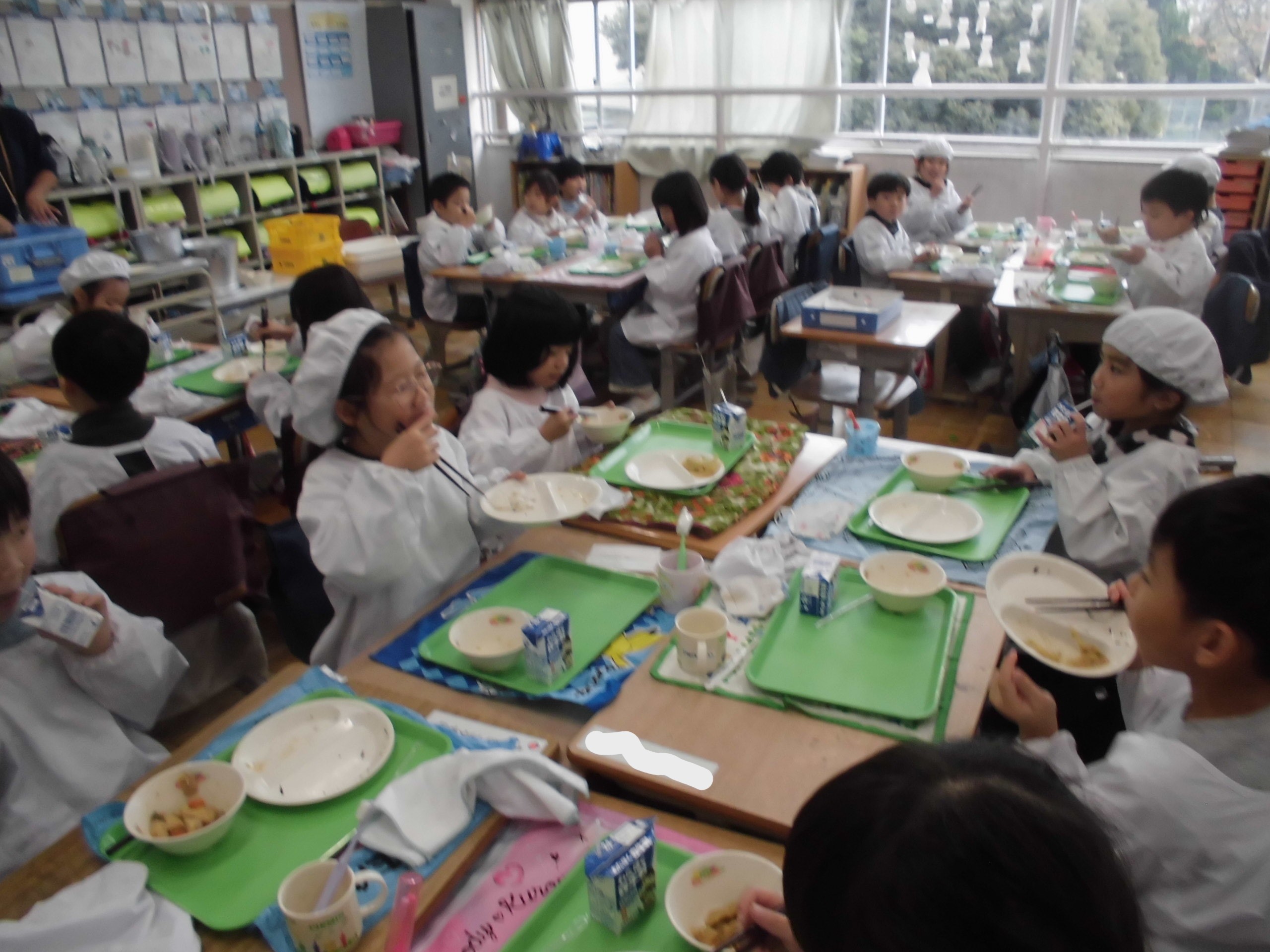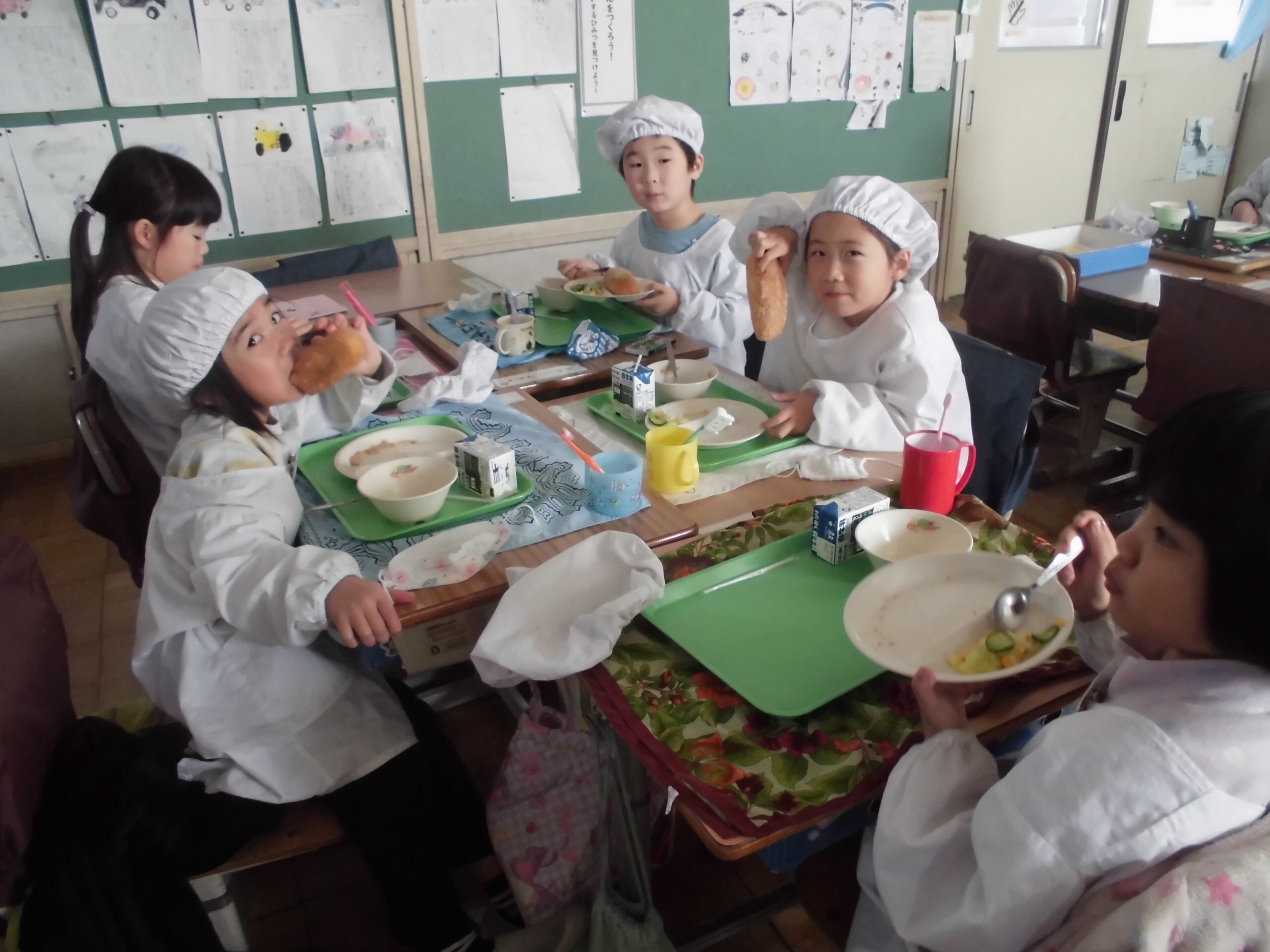 1年生は、給食をしっかり食べます。「ひじきマリネサラダ、おかわりしたよ~」と言いながら、モリモリ食べていました。大きく、たくましく成長してください。