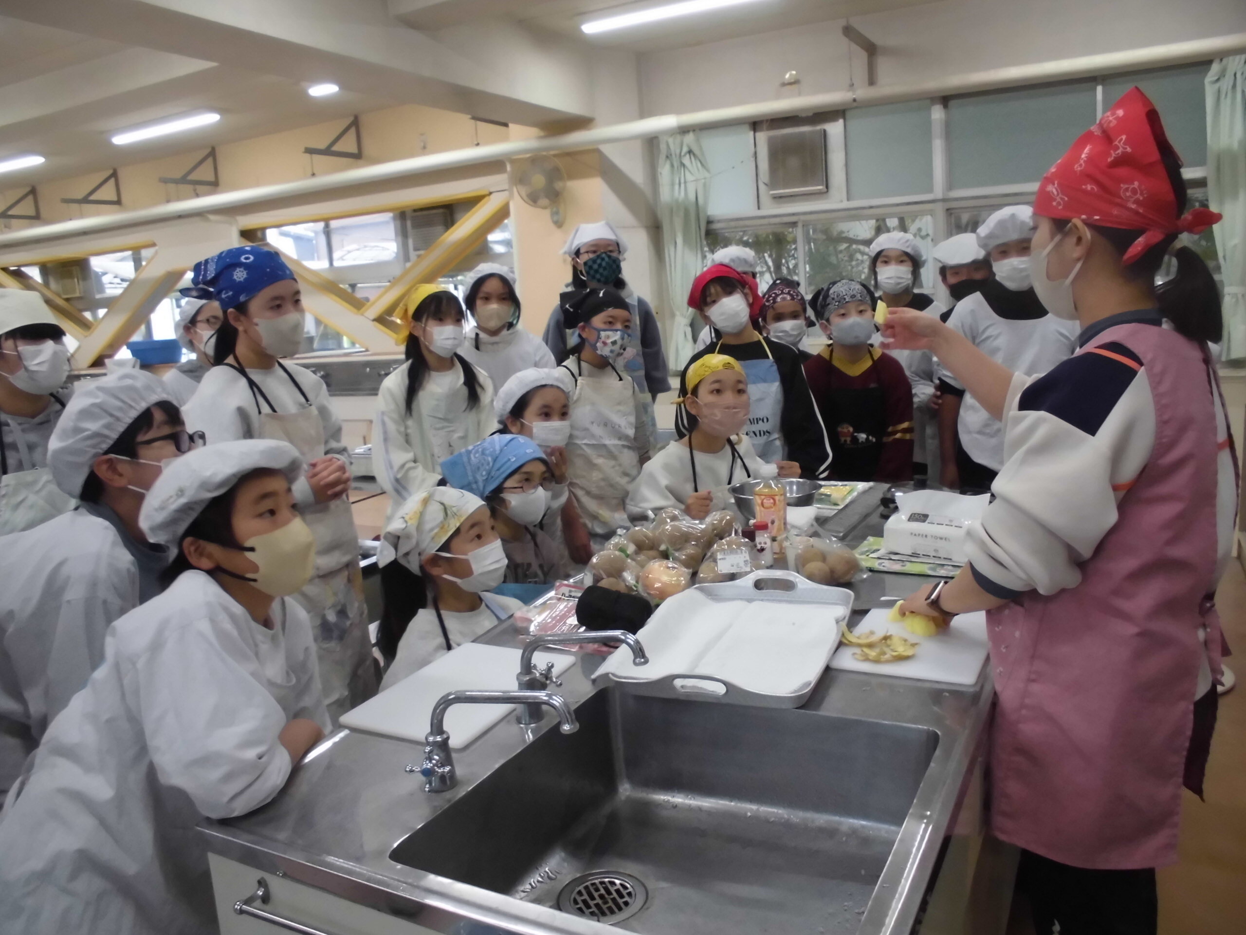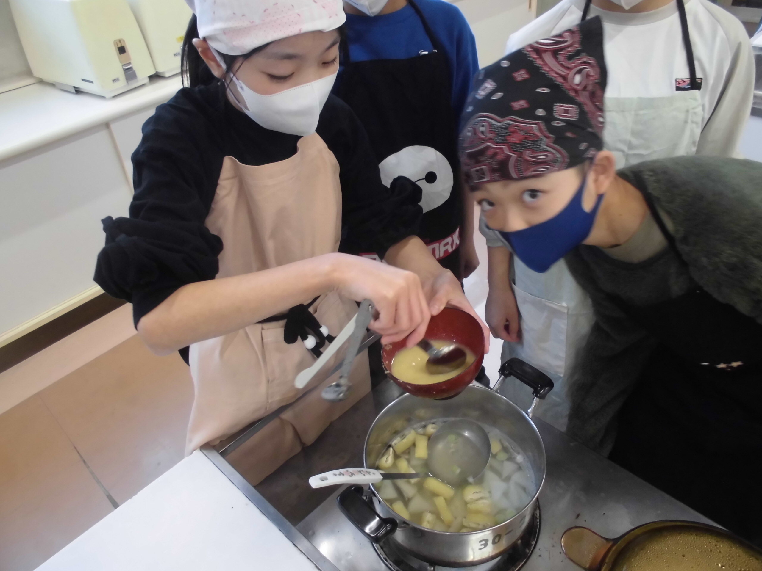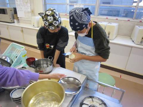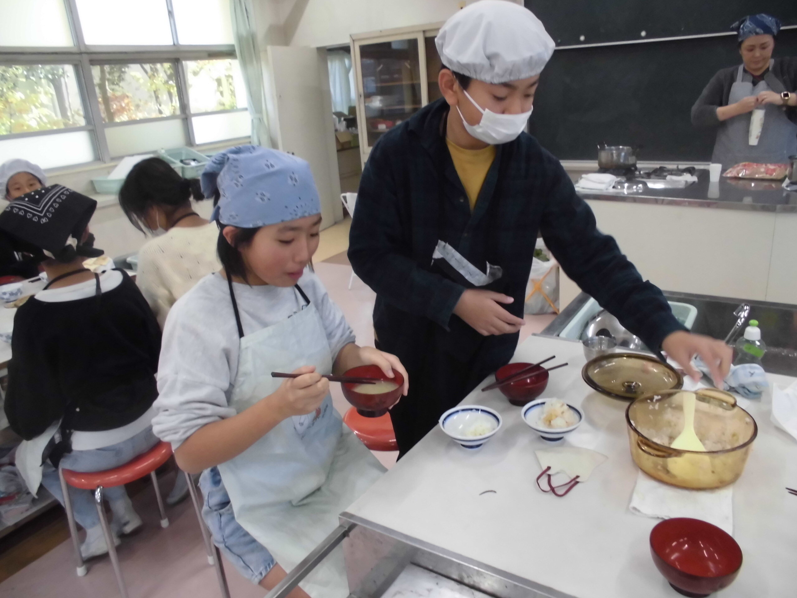 5年生は、家庭科で調理実習に取り組みました。「ごはん」と「みそ汁」作りです。ごはんが炊き上がるタイミングで味噌汁ができあがるように計画を立てましたが、初めてのことに悪戦苦闘しながら作っていました。「うえみずごはんと同じ味がする!」と感激しながら食べている子どもたちでした。