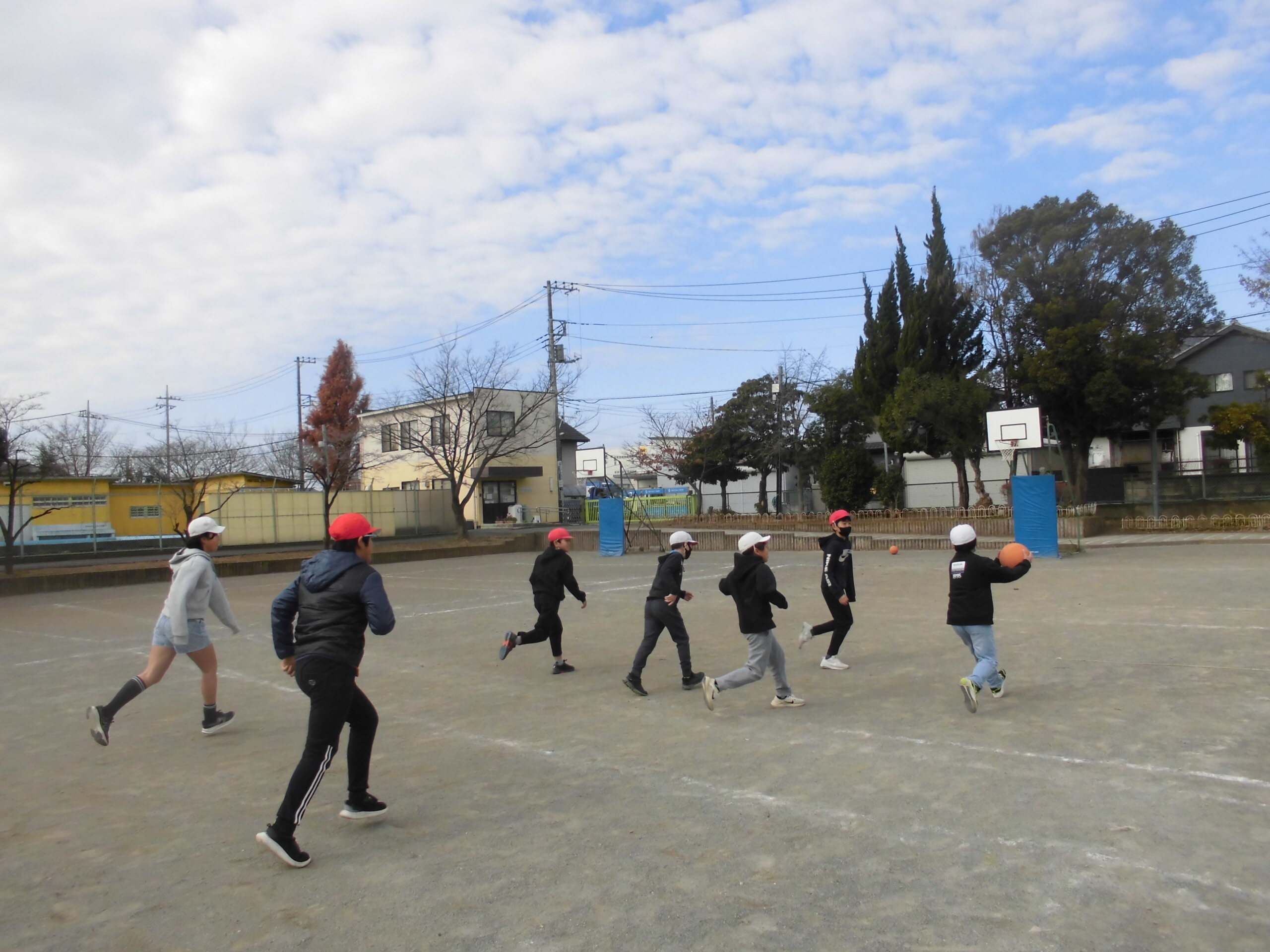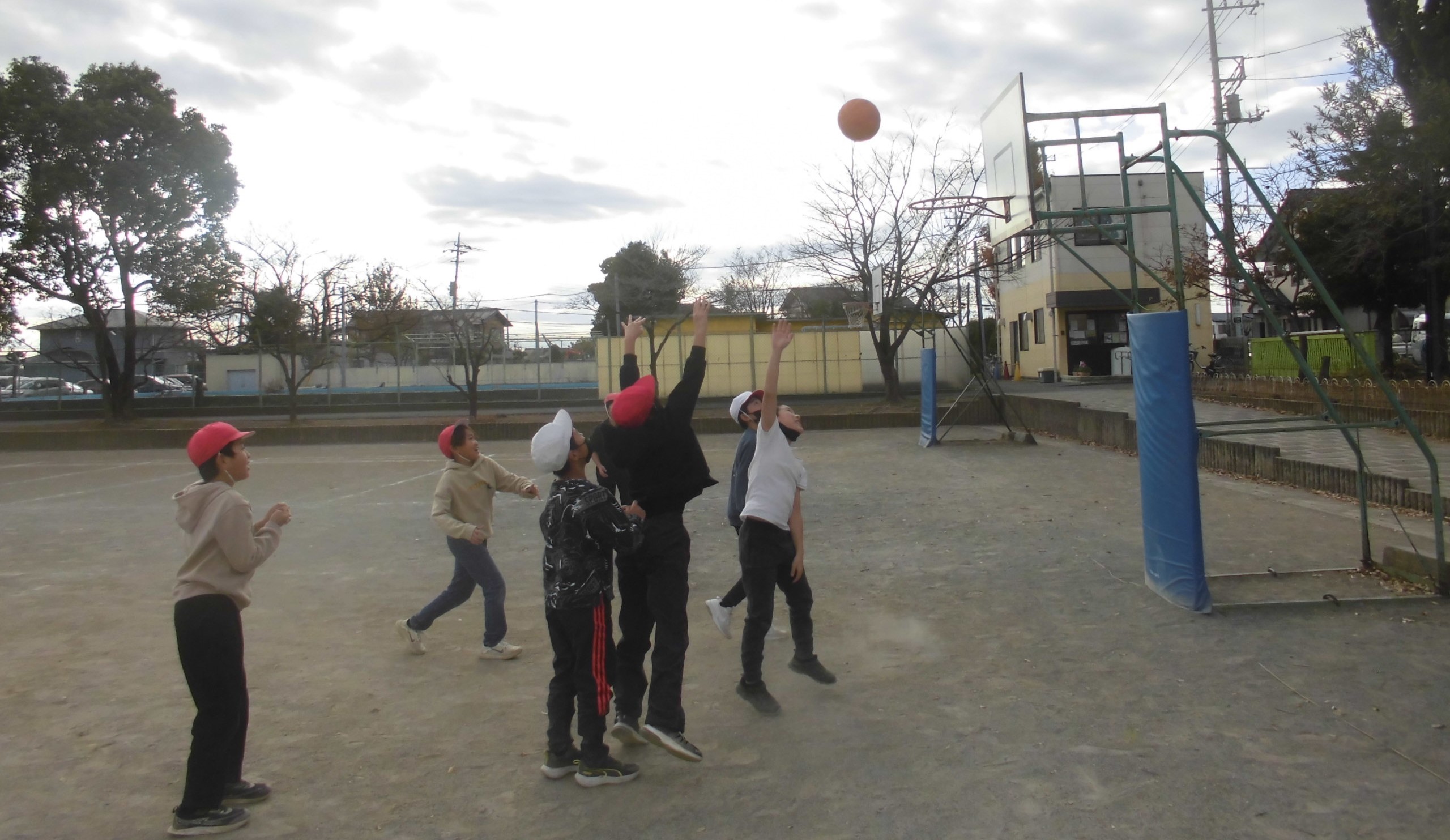 休み時間の校庭では、子どもたちがバスケットボールを楽しんでいました。休み時間は大いに体を動かし、頭の中を入れ替えて、次の授業に臨んでください。
