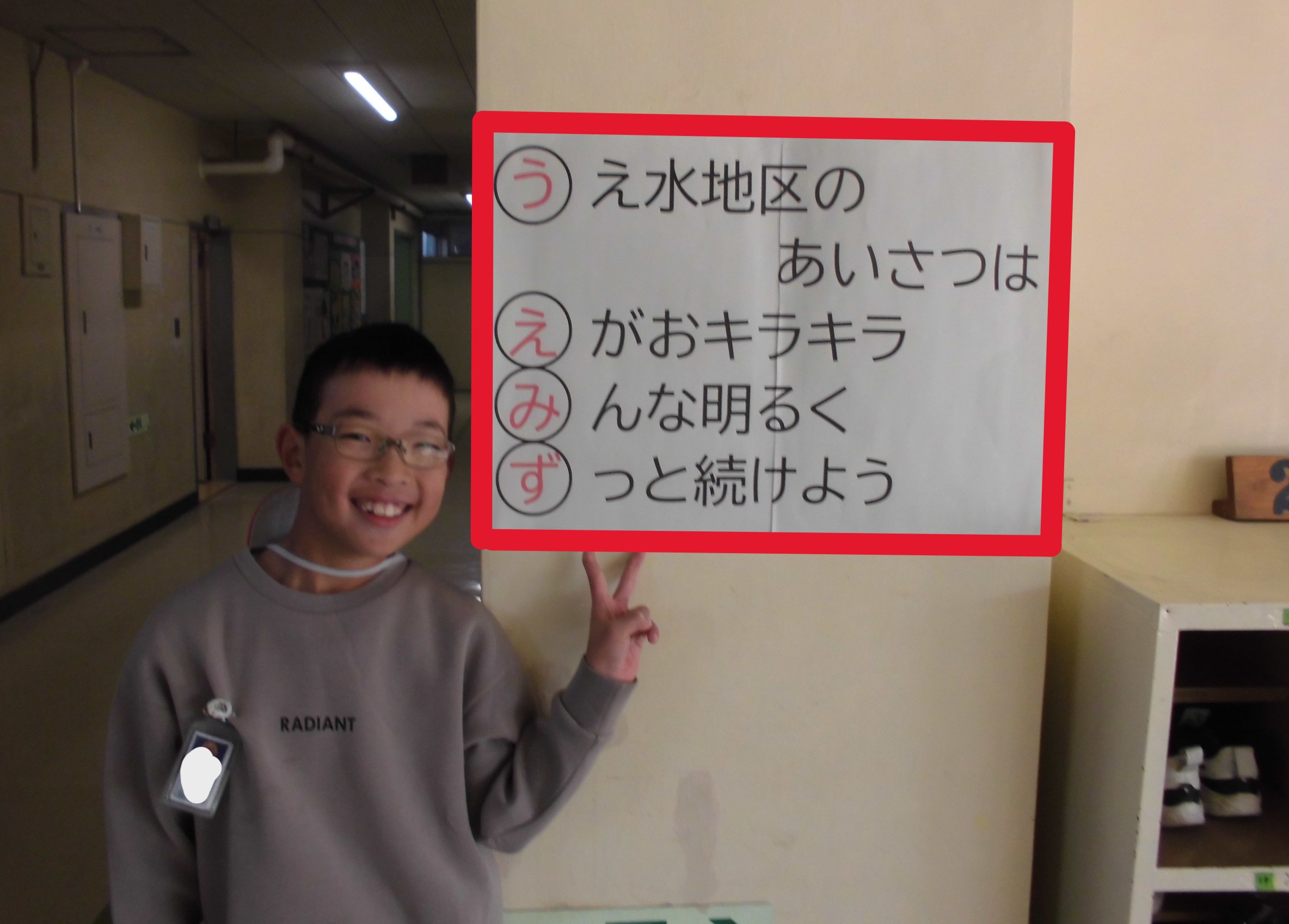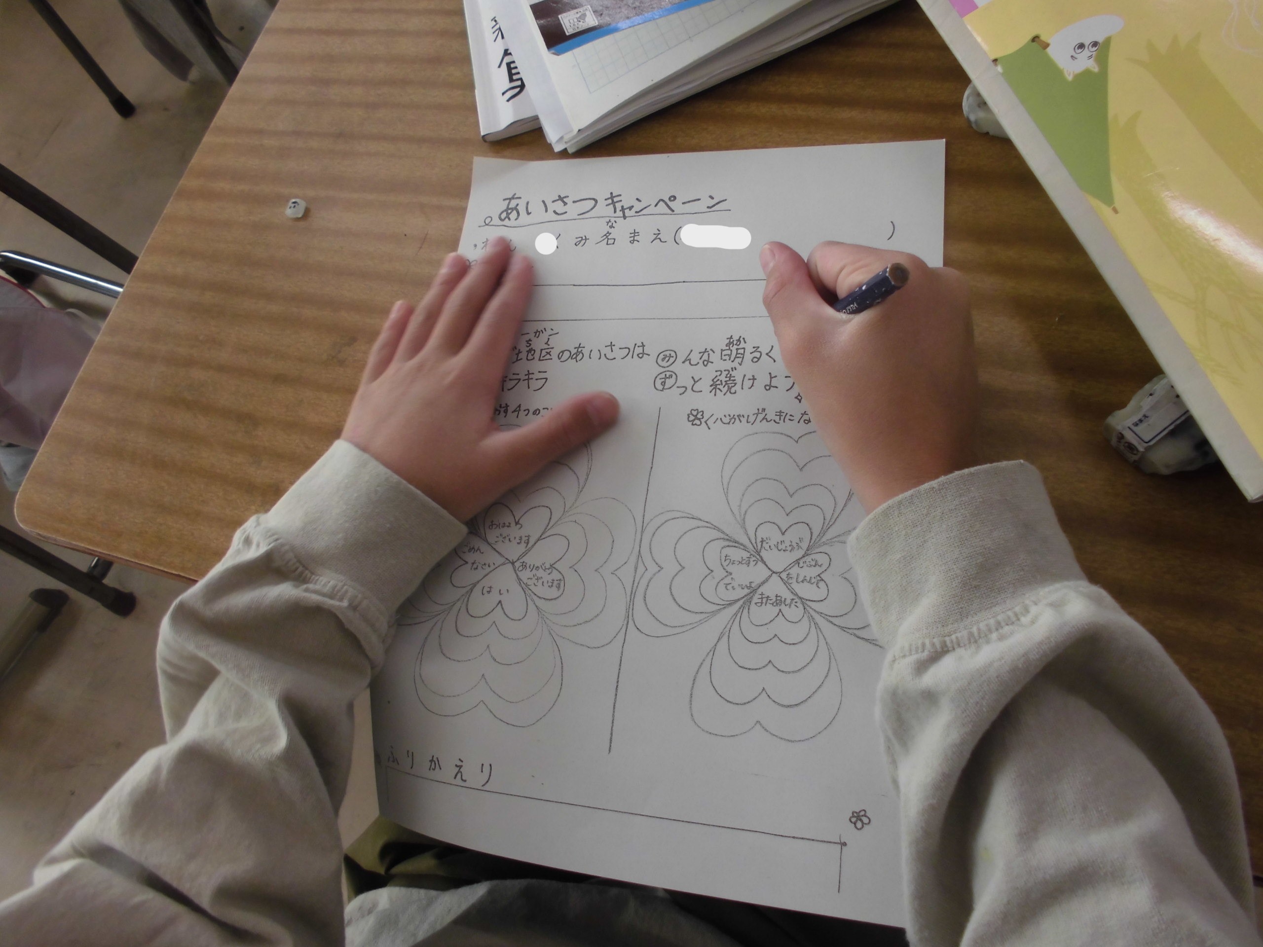 今日から「あいさつキャンペーン」が始まりました。各自が目標をもって取り組んでいきます。あいさつあふれる植水小、植水地区にしていくために、ご家庭でも話題にしてください。よろしくお願いいたします。