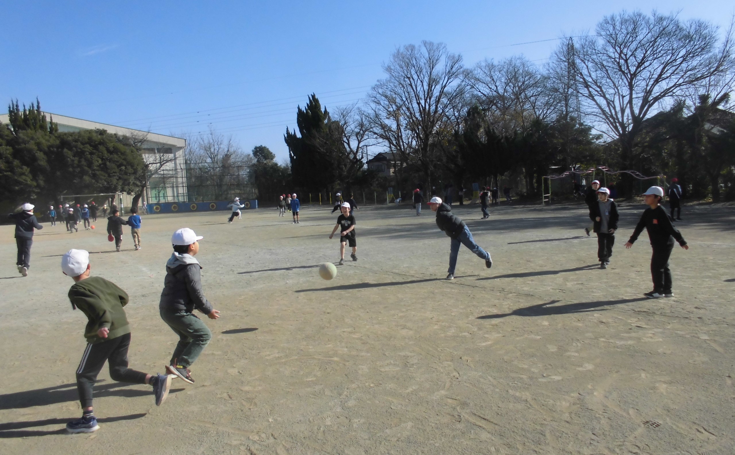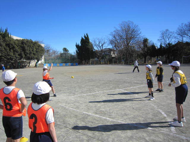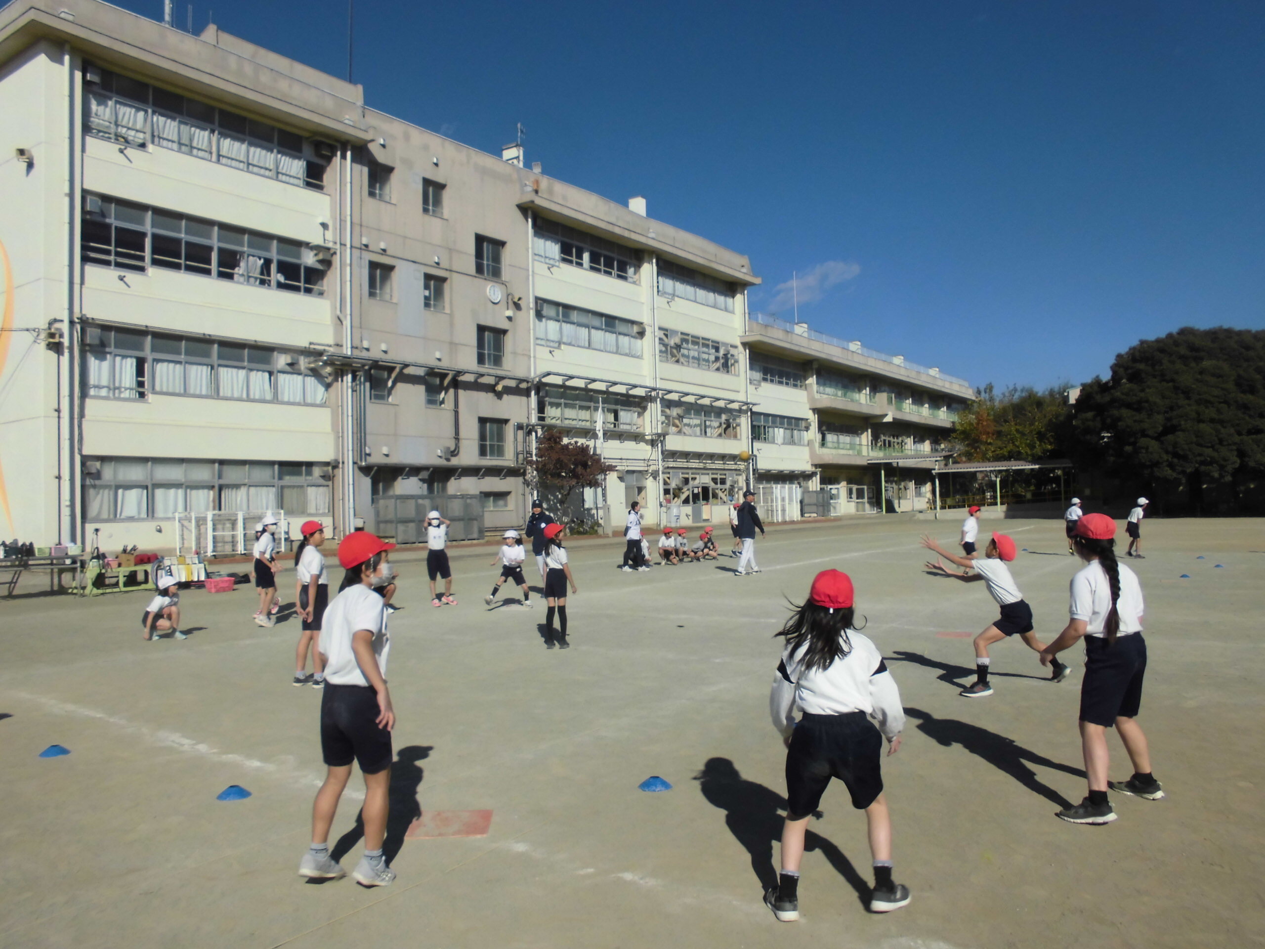 4年生は体育で「ハンドベースボール型ゲーム」を行っていました。チーム同士声をかけ合いながら取り組む姿はいいですね。次の試合に向けて、課題について話し合い、より強いチーム作りを目指してください。