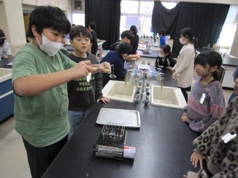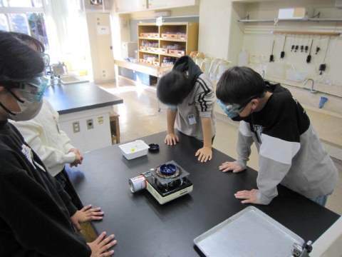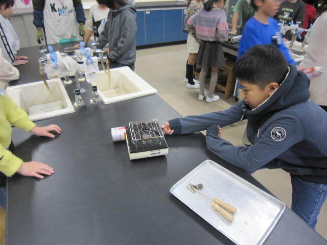 話を戻します。4年生は体育では外でハンドベースを行っていました。打たれたボールを、守備のチームで指定の円の中に集まって走者をアウトにするルールです。ある意味本当の野球よりもチームワークが重要です。円に近い所に守備を集中させるのか、ボールが飛びやすい所なのか…考えることが大切です。勝てるようにチームで作戦を練ってください。理科の実験では、「金属のあたたまり方」について学習しました。金属の棒や板を熱するとどのような順番でどこまであたたまるでしょうか。子どもたちは、自分たちの予想と照らし合わせて結果から、金属のあたたまり方について学ぶことができました。今回も火を使うので慎重に行いました。