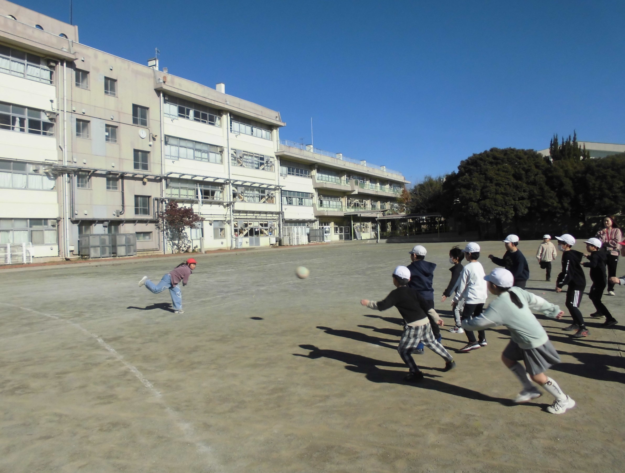 最後に、昼休みの校庭では、ドッチボールに励む植水っ子たちの姿がありました。とてもきれいなフォームで投げる子どもの姿を、タイミングよく撮ることができました。これからも、ボールをたくさん投げて、たくさん取って、ドッチボール上手になってください。