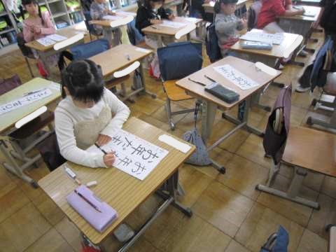 1年生は書きぞめの「お年だま」をフェルトペンで練習していました。ある子はこの「お年だま」何円?と聞いたら1円‥‥と答えていました。あらあらご謙遜ですね。上手でしたよ!!!