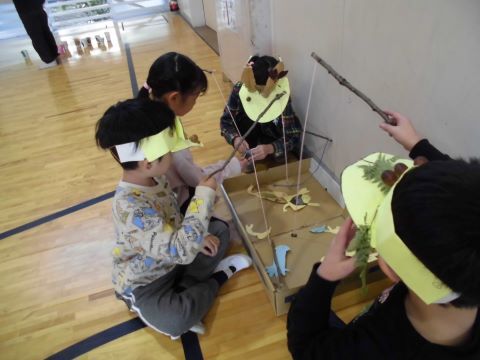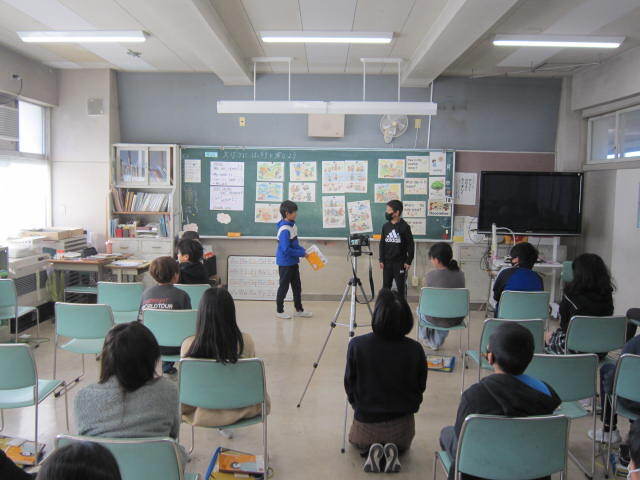 5年生はG・Sルームで「桃太郎」をモチーフにした英語劇を行っていました。各グループで、「鬼ヶ島」や「犬・猿・キジ」を別の物に変えて、オリジナルのストーリーにしていました。みんなの前での恥ずかしさもありながら英語を覚えて一生懸命発表していました!