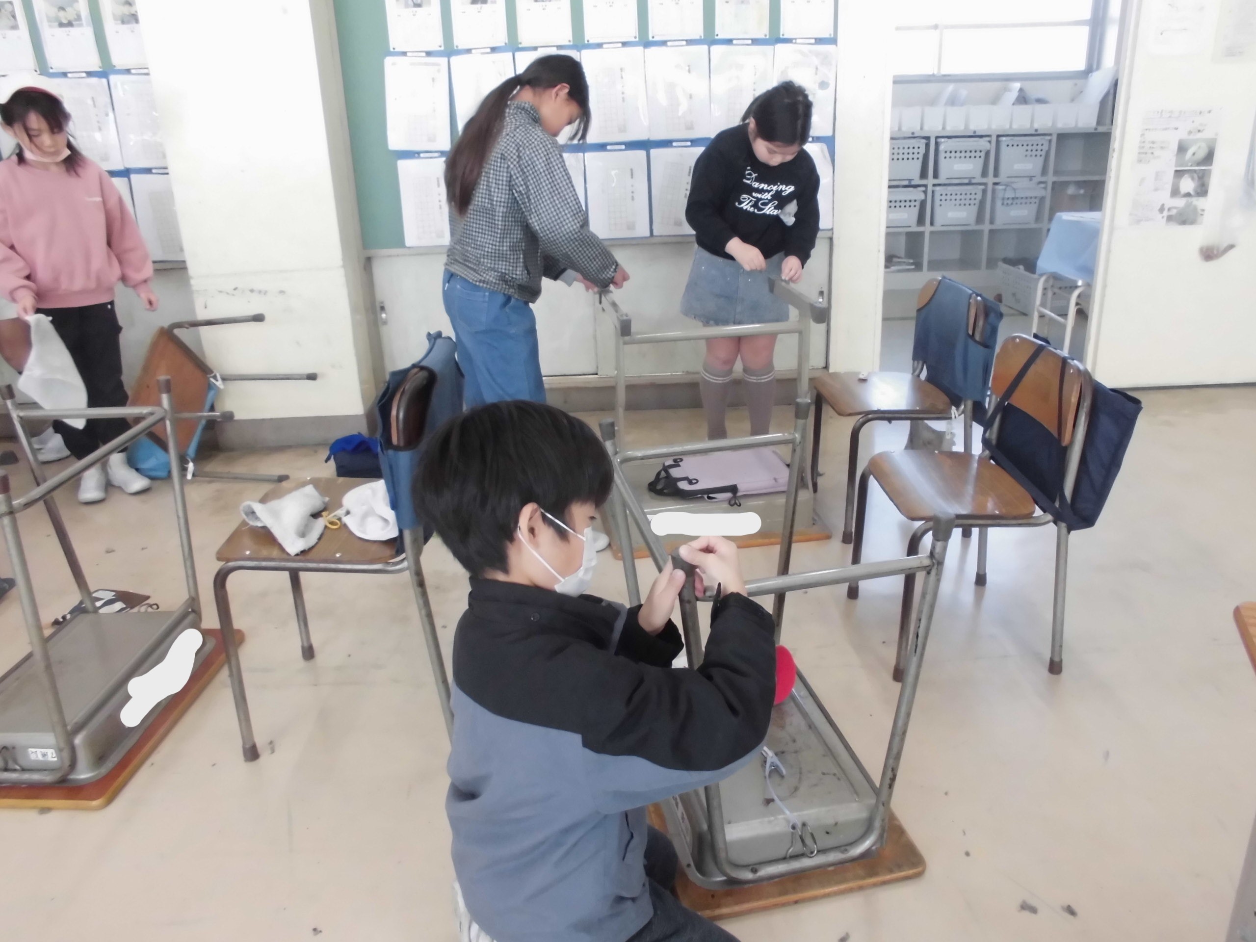 さて、朝は安全朝会(竜巻想定)を行いました。教室では、机を使った「シェルターづくり」に取り組みました。