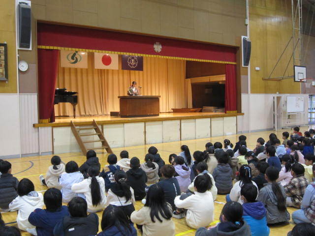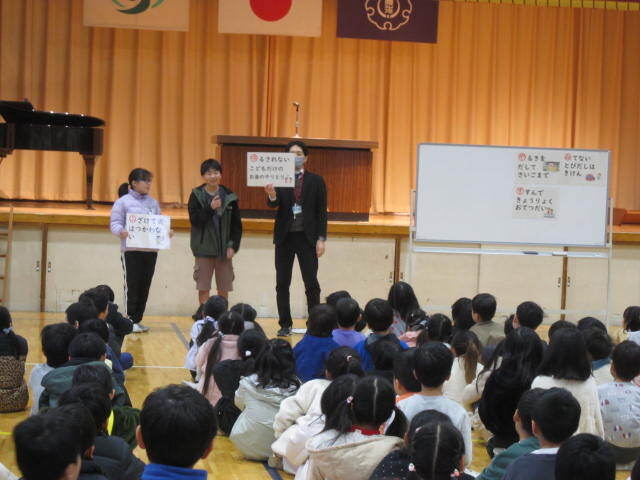 終業式が終わったあと、「冬休みの生活」について話がありました。6年生2人にも手伝ってもらい、火遊びをやってはいけないことと、お金のやり取りを子どもだけで行ってはいけないことを確認しました。冬休みがトラブルなく楽しく生活できるように、みなさんで気をつけましょう!!