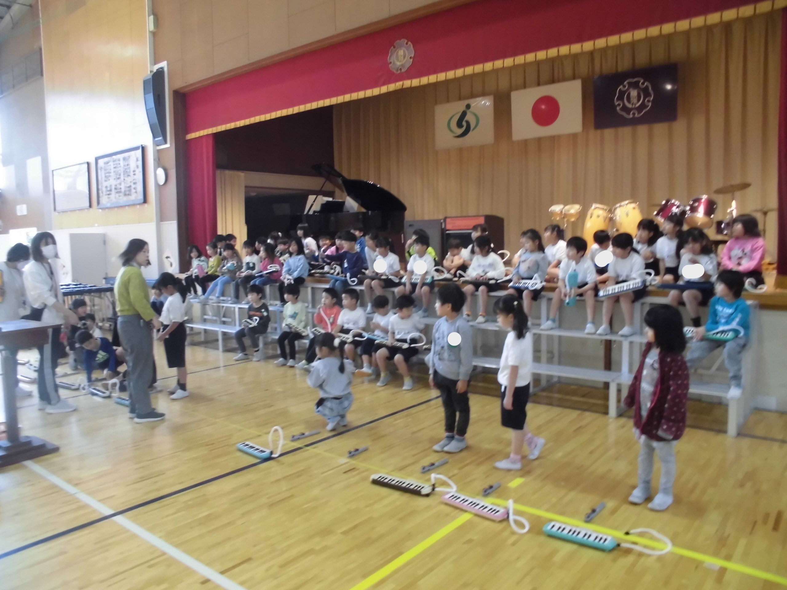 さて、朝はテレビで音楽朝会を行いました。今月の歌は「帰りの会のサンバ」です。リズミカルで楽しい曲なので、子どもたちはとても気に入っているようです。マラカスなどの楽器も使いながら練習しています。
