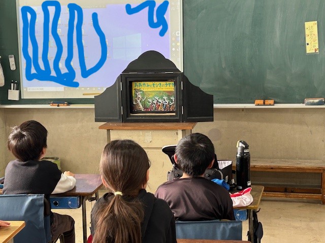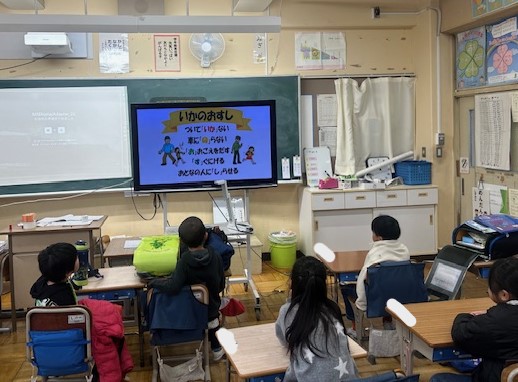 こんにちは。今朝は、各教室では「読書タイム」を行いました。1年生の教室では、モニターを使って読み聞かせをしていました。子どもたちは食いつくように話を聞いていました。