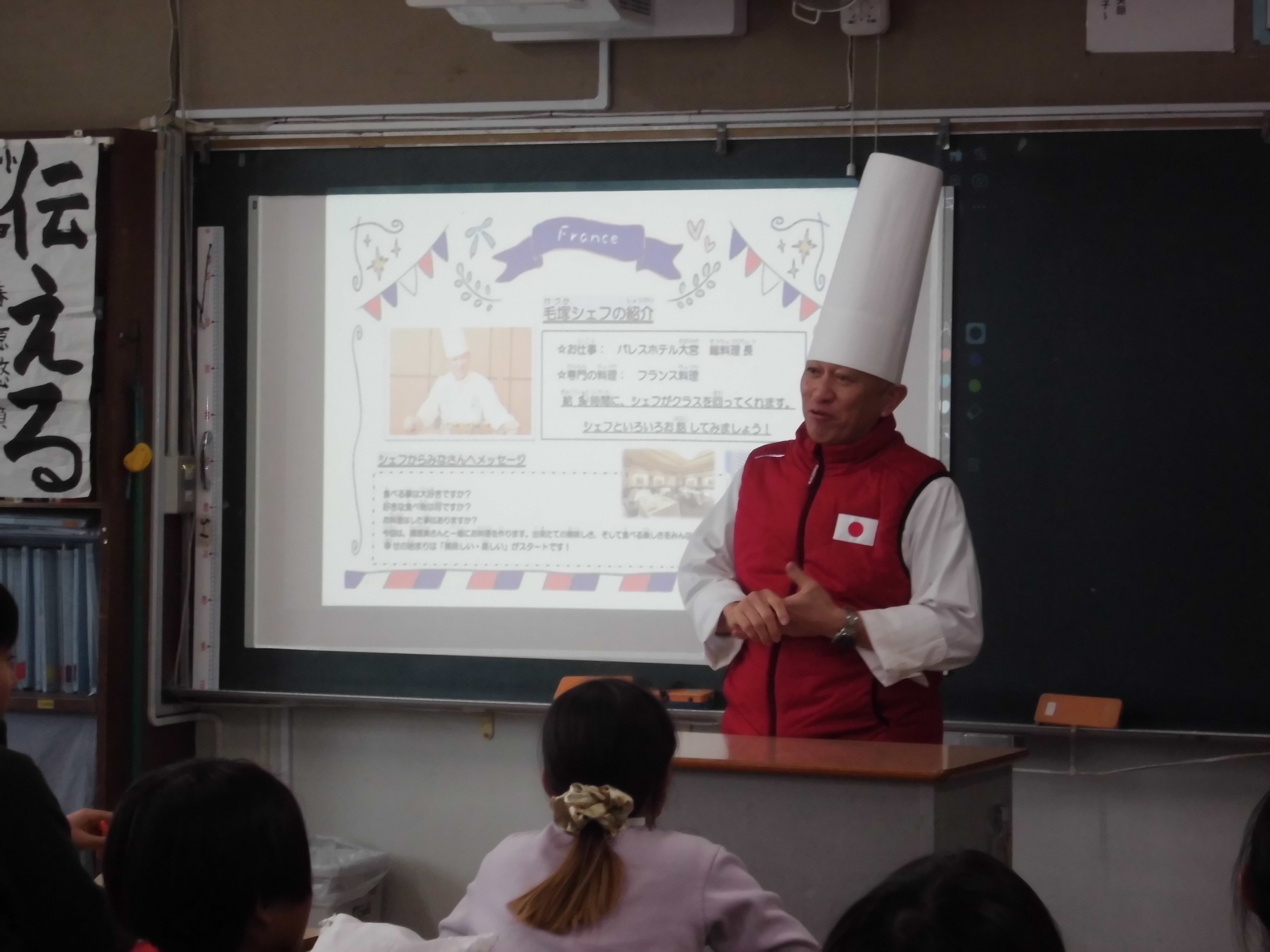 ★今日は、待ちに待った「シェフ給食」です。パレスホテル大宮の総料理長毛塚智之シェフが来校し、調理員さんと一緒に給食を作ってくれました。給食ではなかなか食べることができないフランス料理を味わうことができ、子どもたちも大喜び!いつも以上に会話も弾み、楽しそうに給食時間を過ごしていました。