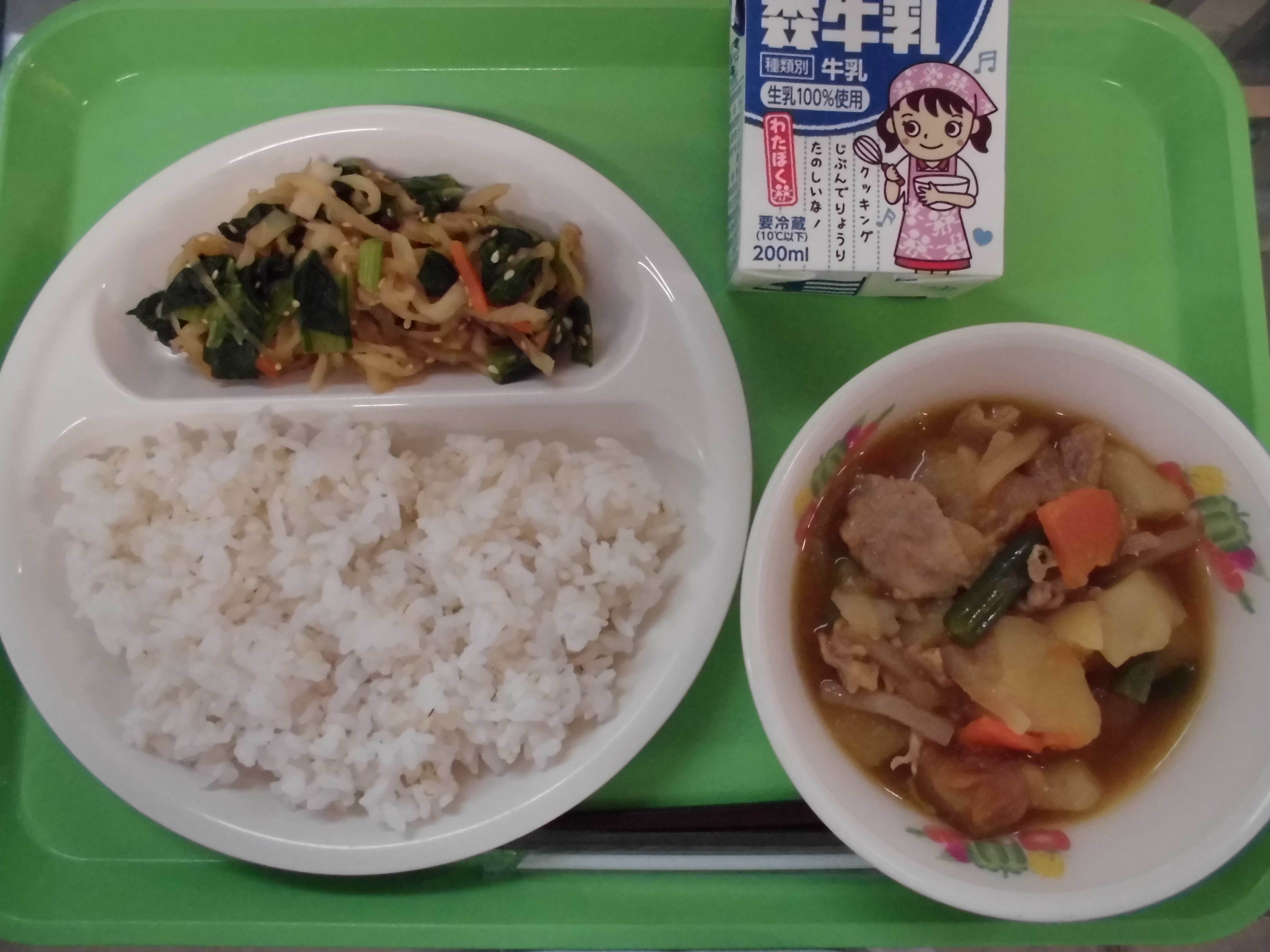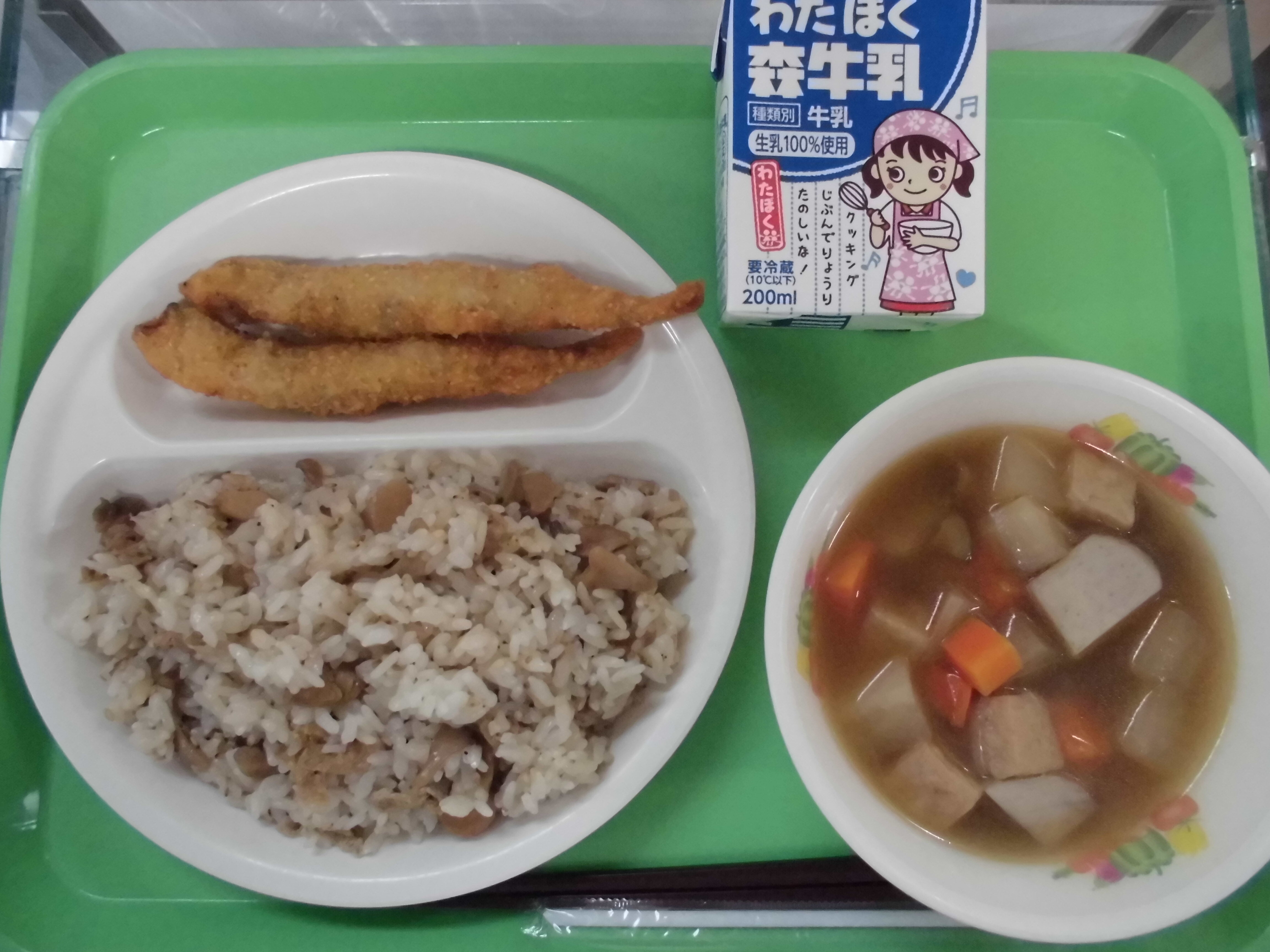 ★今日は、れんこんご飯です。れんこんは、秋から冬が旬の野菜です。秋のれんこんは、やわらかくてしっとりとしていて、冬のれんこんは、ねばりがでて甘みが増します。今日のれんこんもとても美味しかったです。全学年よく食べていました。