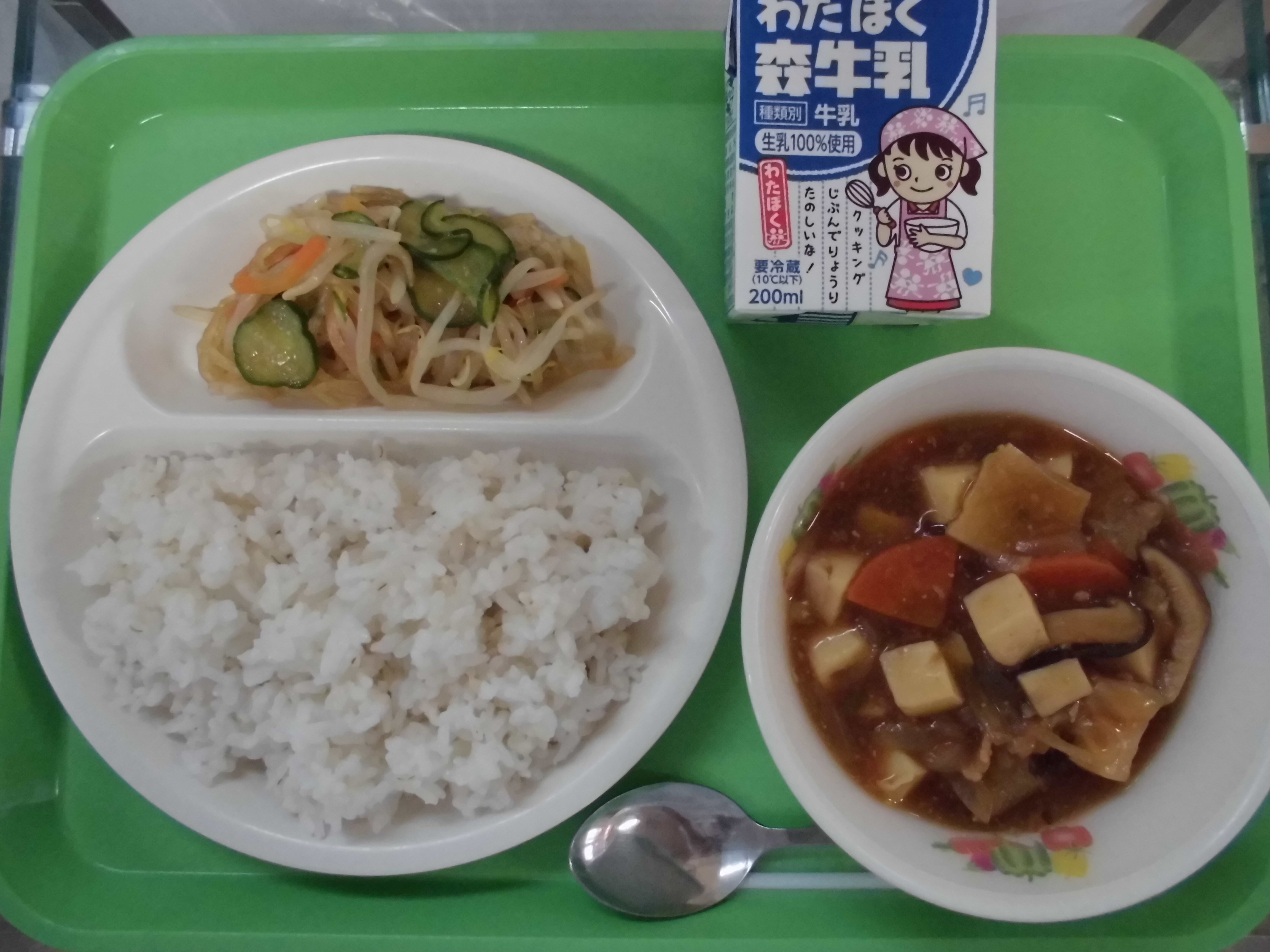 ★今日は、さいたま市の海外の友好都市である「中国」の料理です。給食でもおなじみの四川豆腐。中国の四川地方の郷土料理「四川料理」に由来する四川風の味付けをしたマーボー豆腐です。四川料理といえば、辛さが特徴のひとつですが、給食では低学年も食べやすいように、辛さを抑えて作りました。ご飯もよく進むのか、ほとんど残りがありませんでした。