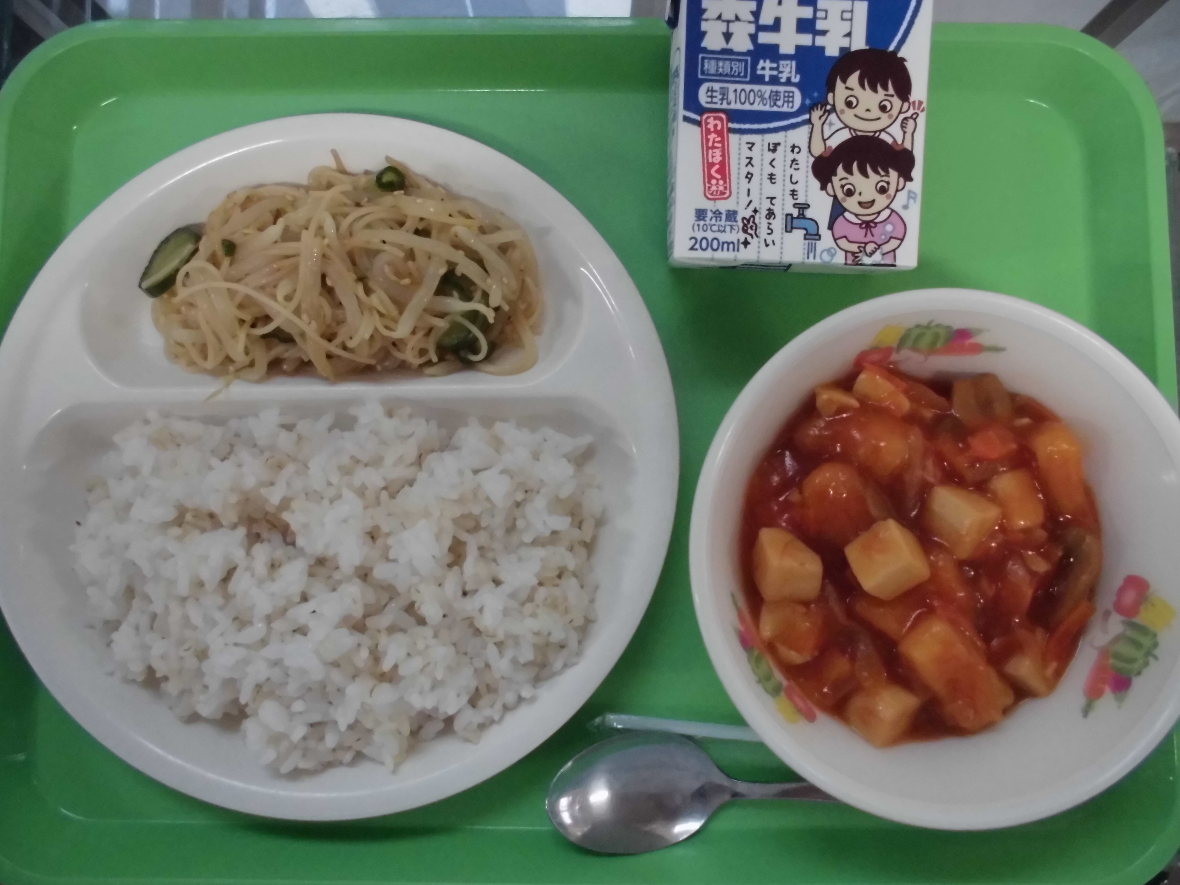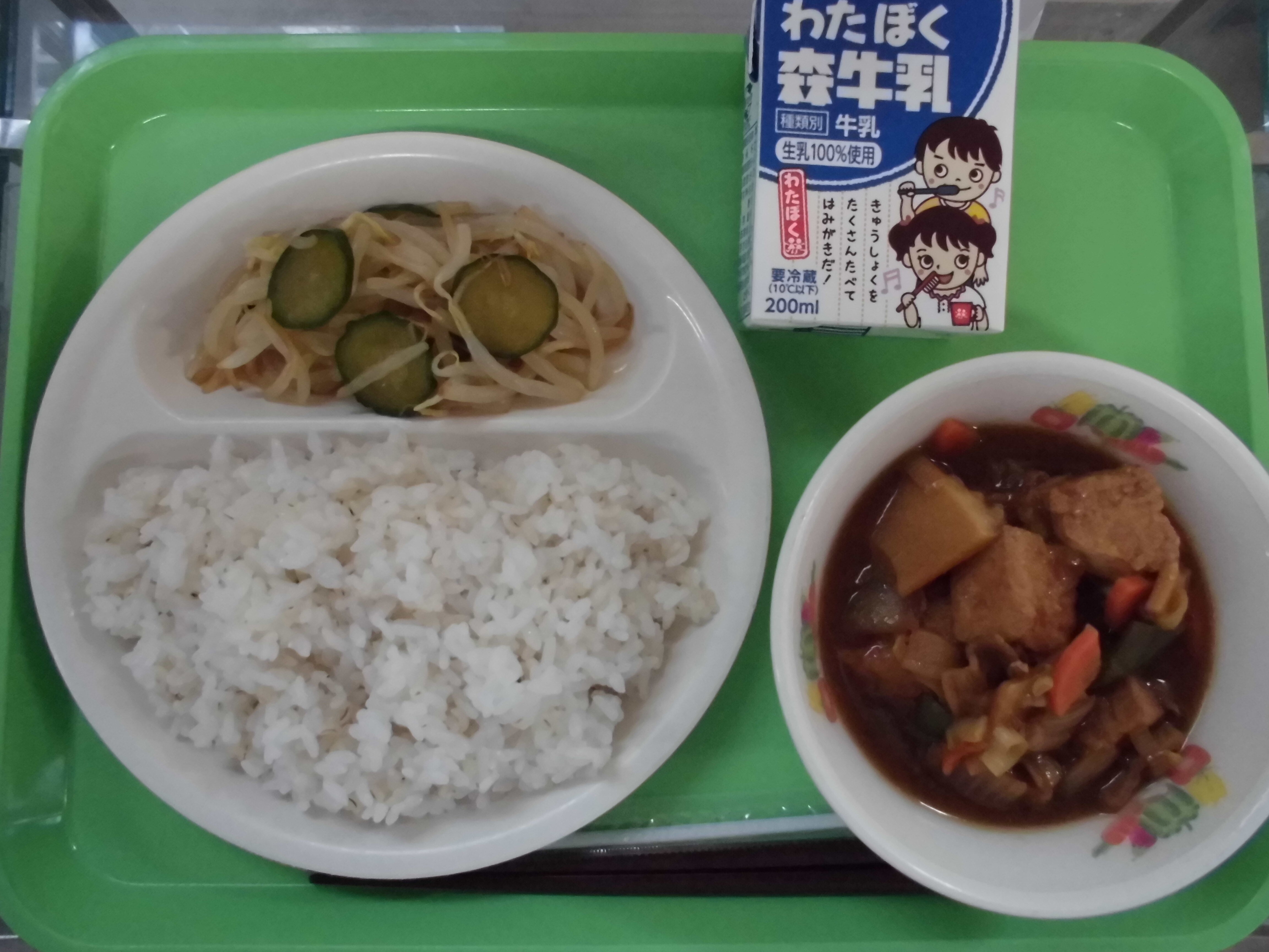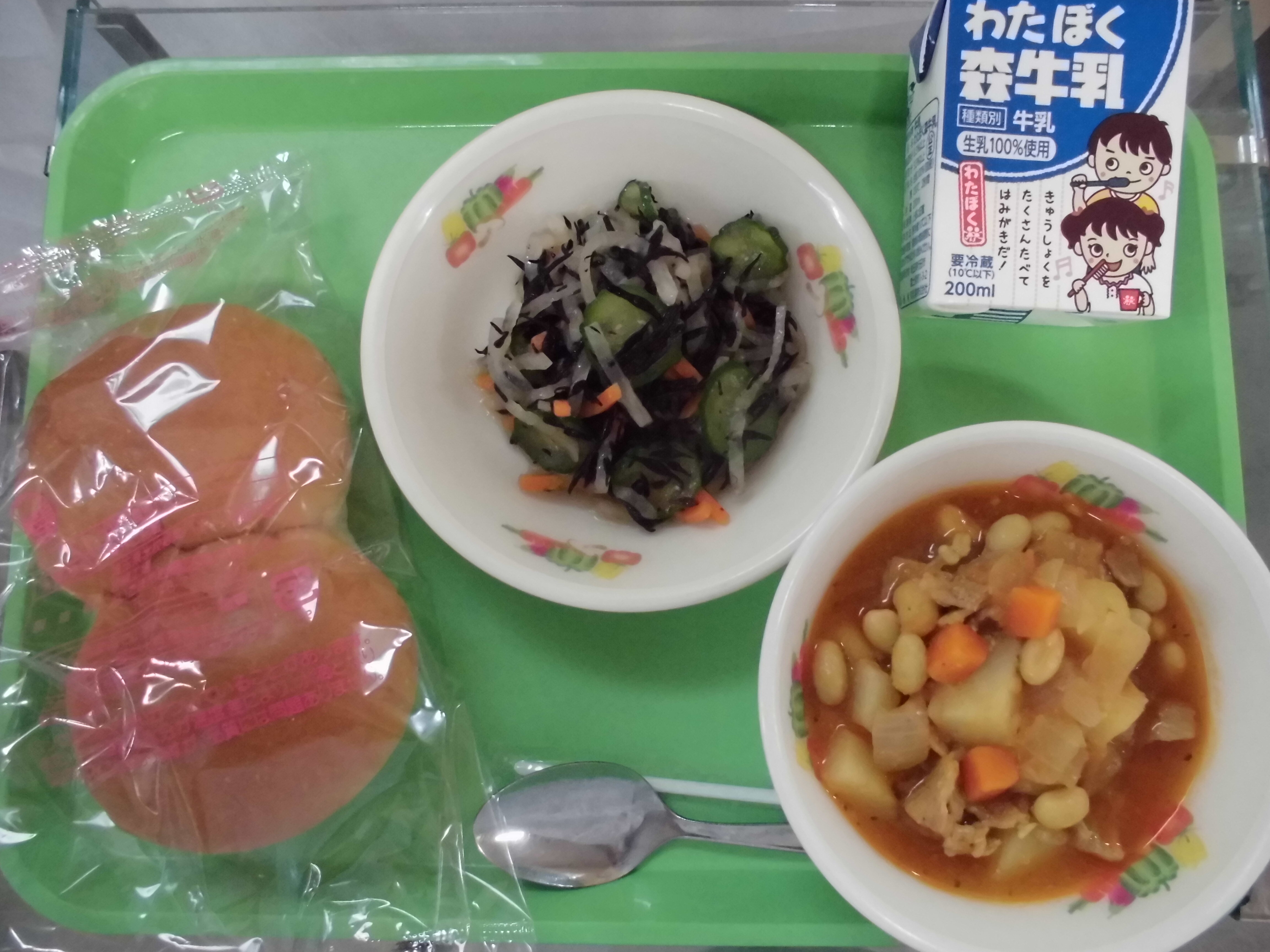★今日は、大豆のインド風煮込みです。どこらへんがインド風なのか…ポークビーンズのようなトマト味ではなく(少しケチャップは入っていますが)カレー粉とウスターソースで味つけしています。隠し味はしょうゆです!カレー味はみんな大好き!ほとんど完食でした。
