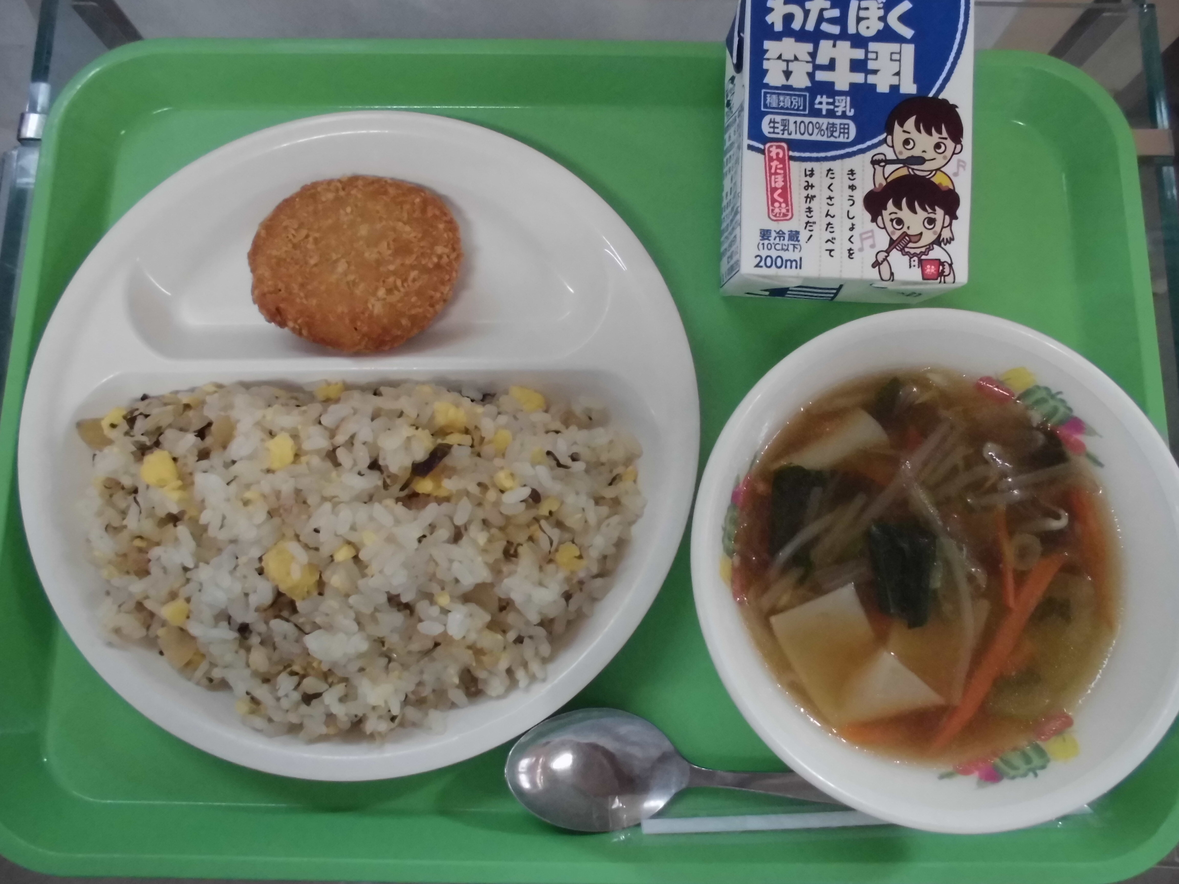 ★「しゃくし菜」とは、埼玉県秩父地方で昔から作られている伝統野菜です。11月~12月に収穫され、保存が効くように漬物にして食べます。今日のチャーハンにもしゃくし菜漬けを使いました。少し酸味がありますが、ご飯との相性は抜群です。どの学年もよく食べていました!