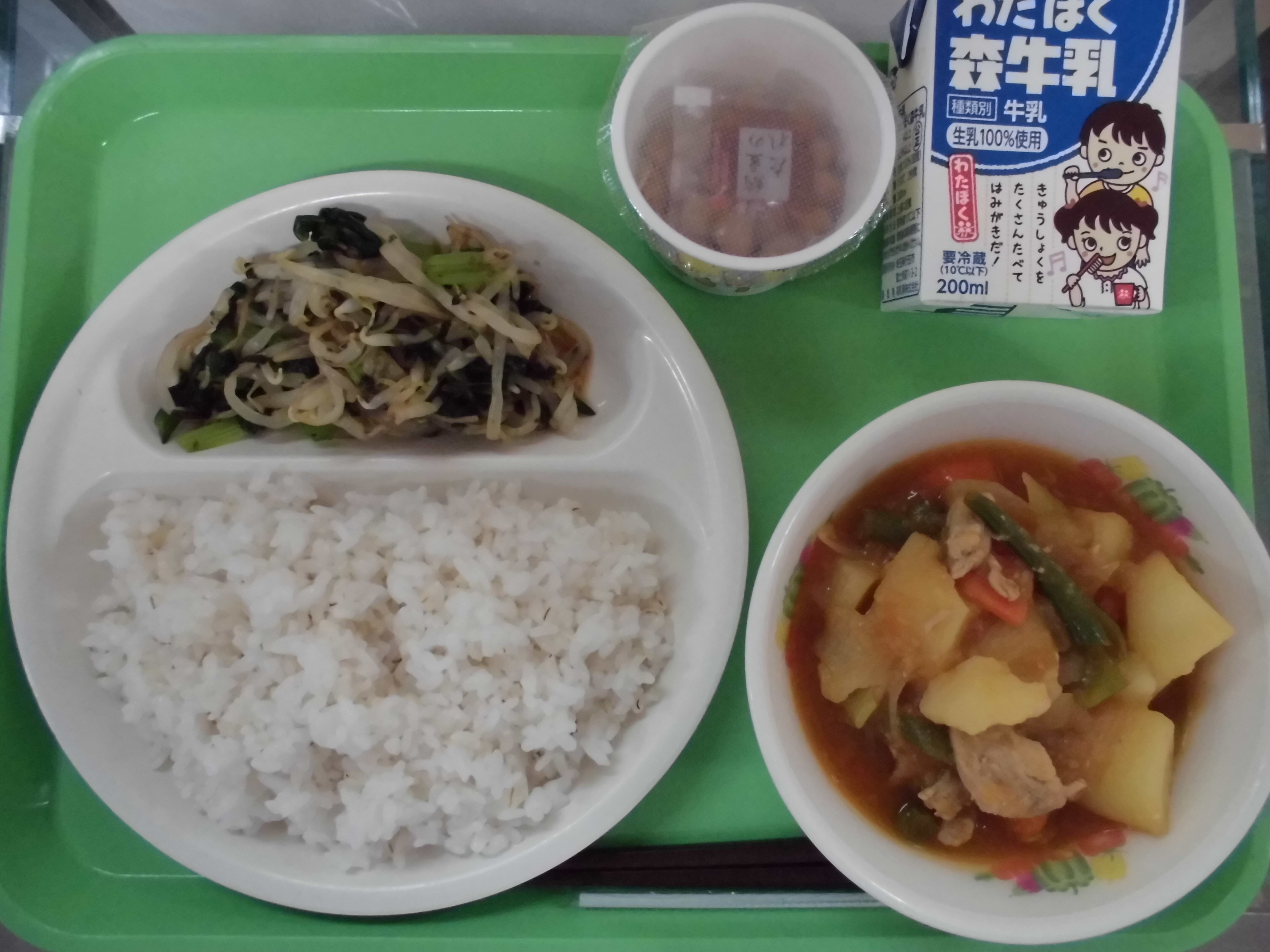 ★今月は「彩の国ふるさと学校給食月間」です。今日の納豆は、生産から加工までを埼玉県で行っている大粒大豆の「彩の国納豆」です。彩の国納豆は、粘り気が少なく、食べ応えがあり、大豆の味がしっかり楽しめます。「辛子がほしい~」なんて声も聞こえてきましたが、頑張ってよく食べていました。
