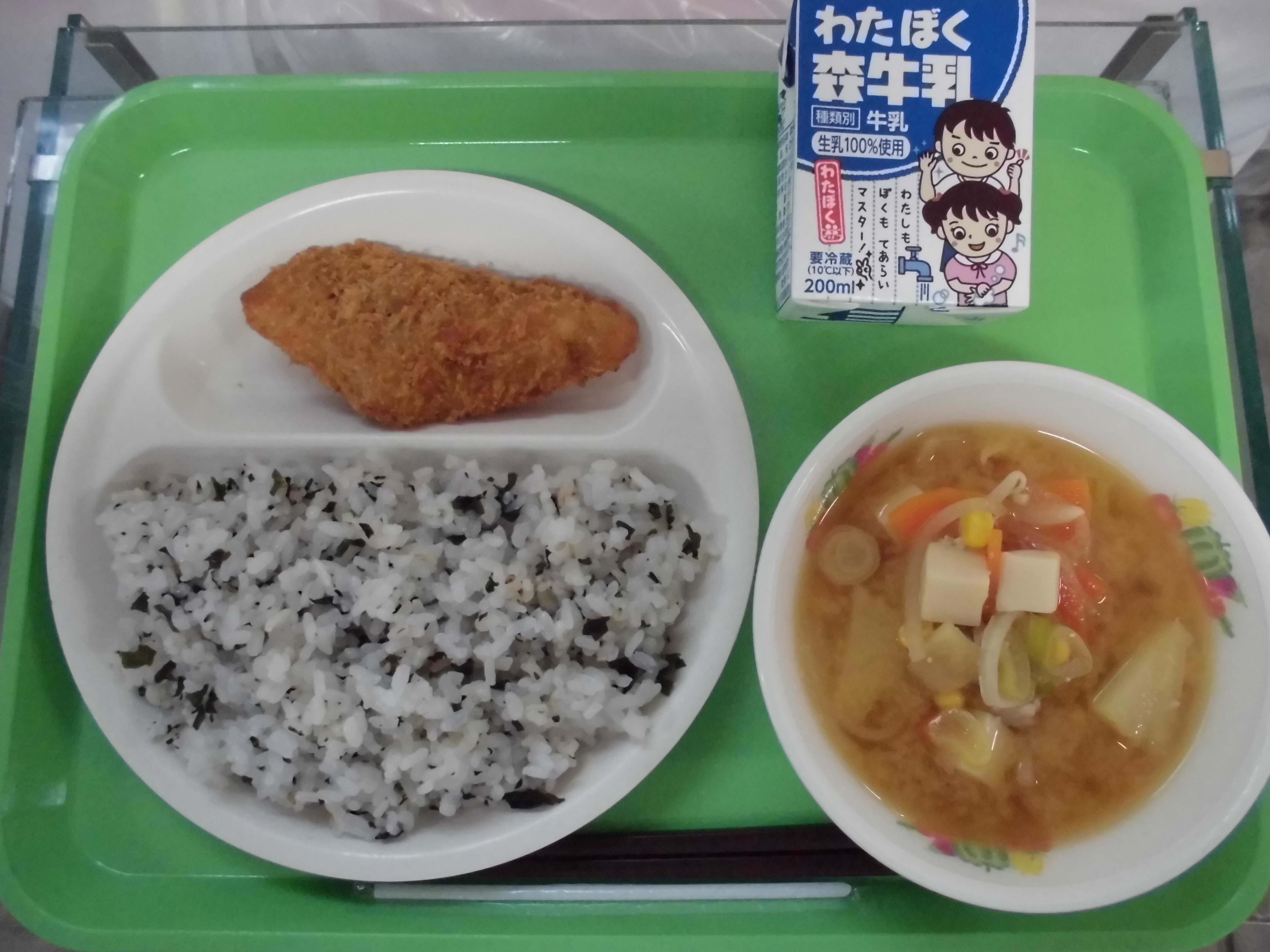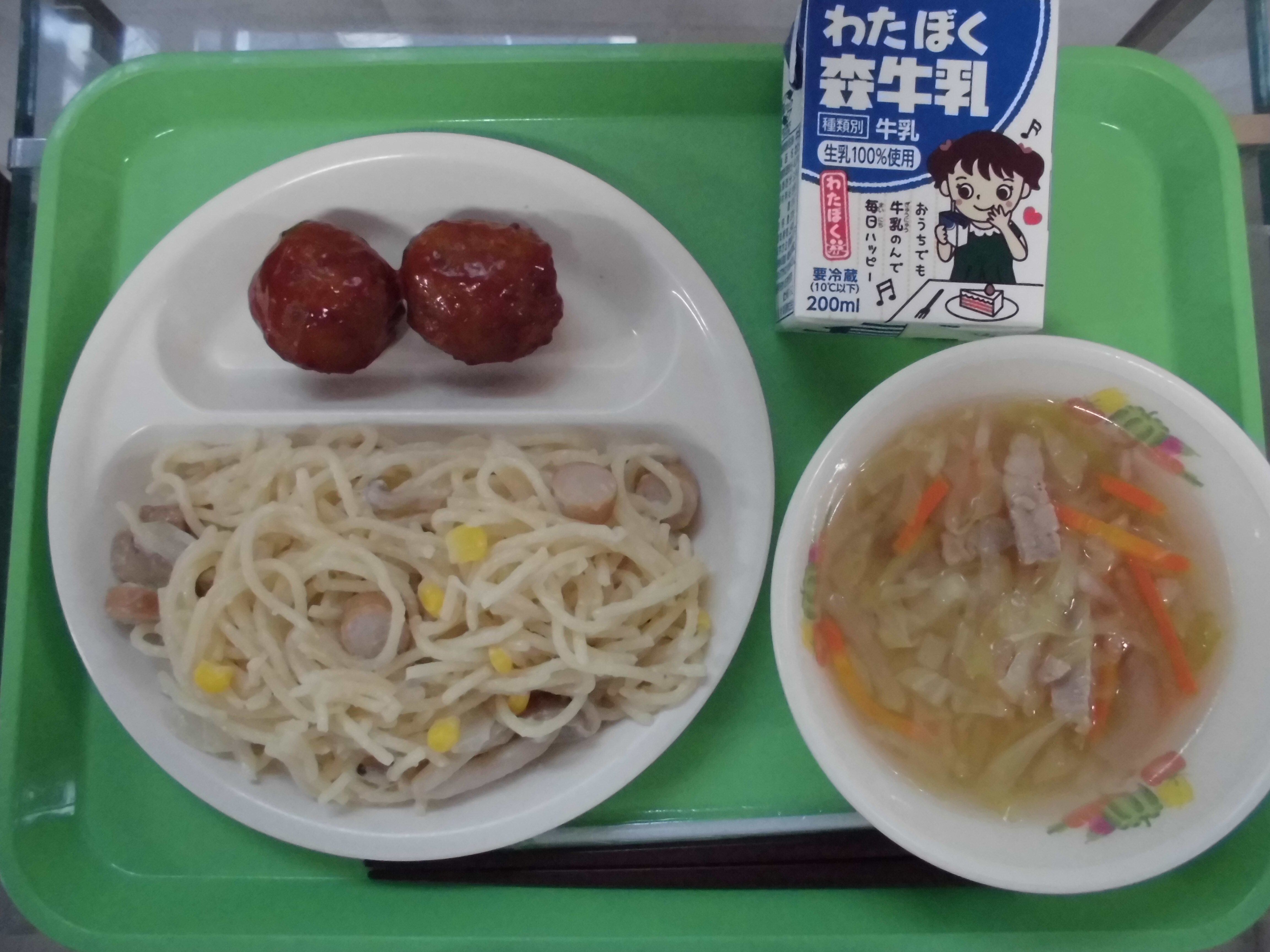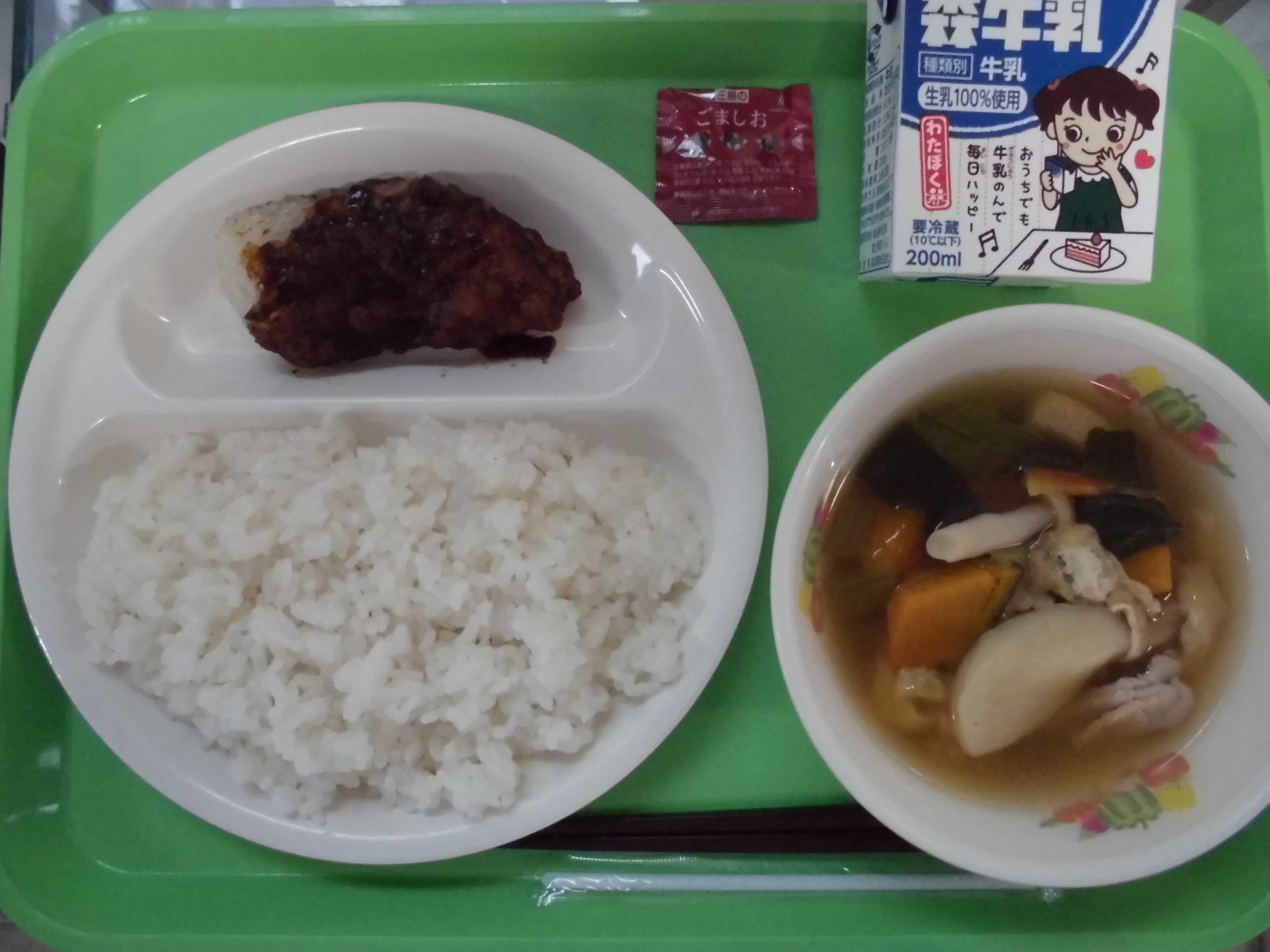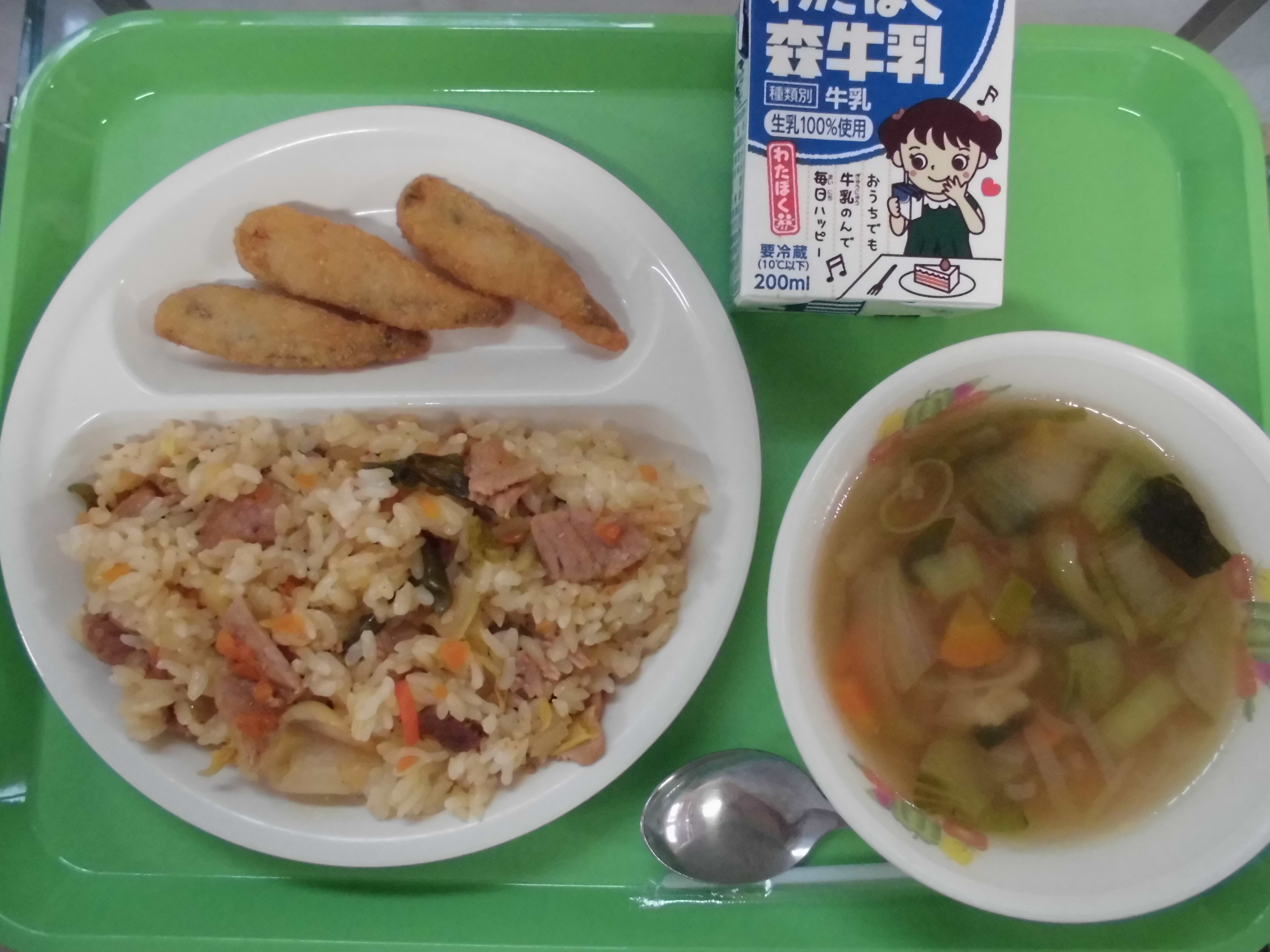 ★今日は、揚げしゅうまいです。写真は焦げているように見えますが…決して焦げているわけではありません…。給食室で、約800個のしゅうまいを調理員さんが揚げてくれました。1年生の中には「初めて食べた」という子も!今後も色々な食材を使用し、バラエティー豊かな給食を提供していきたいと思います。