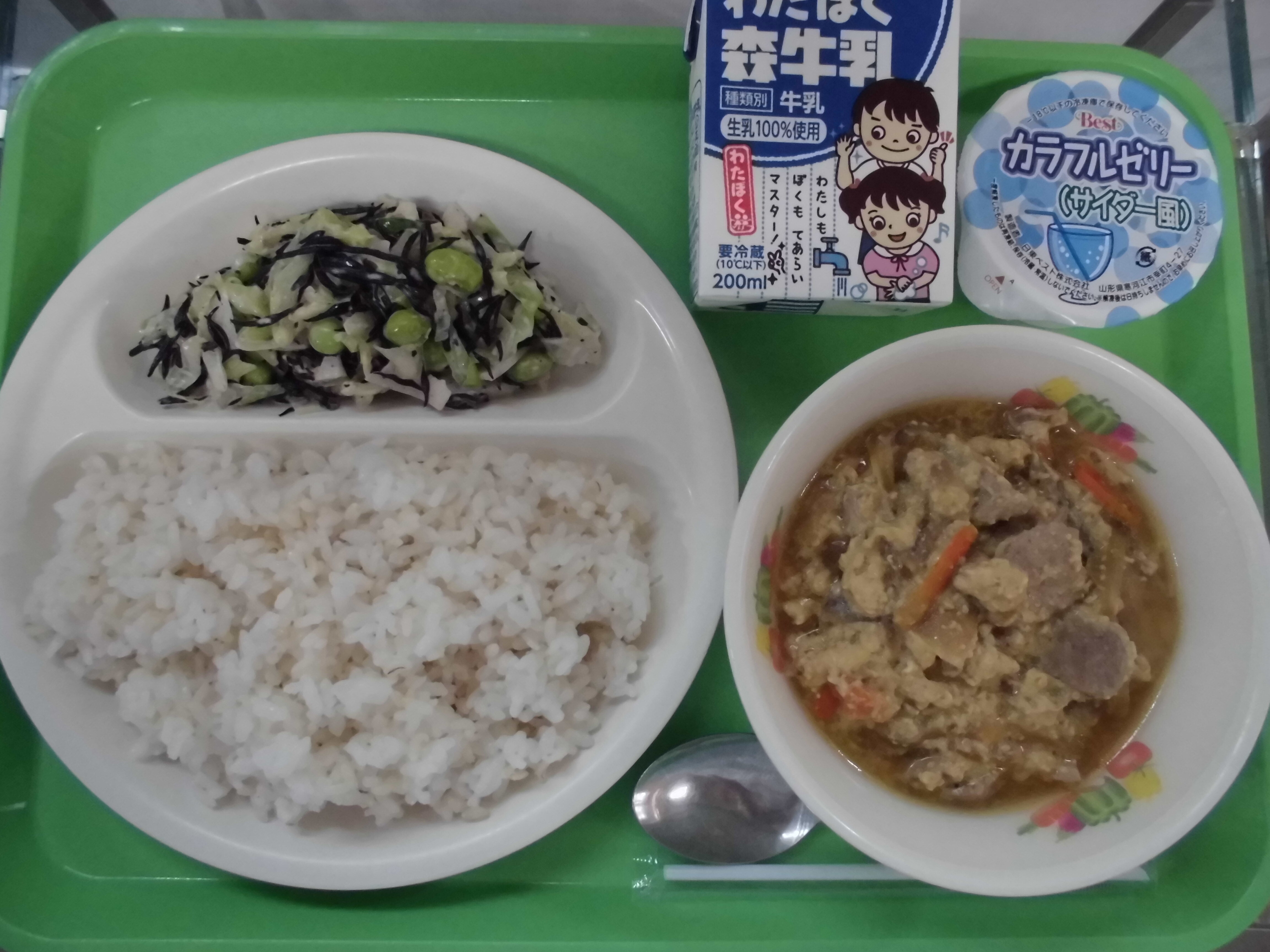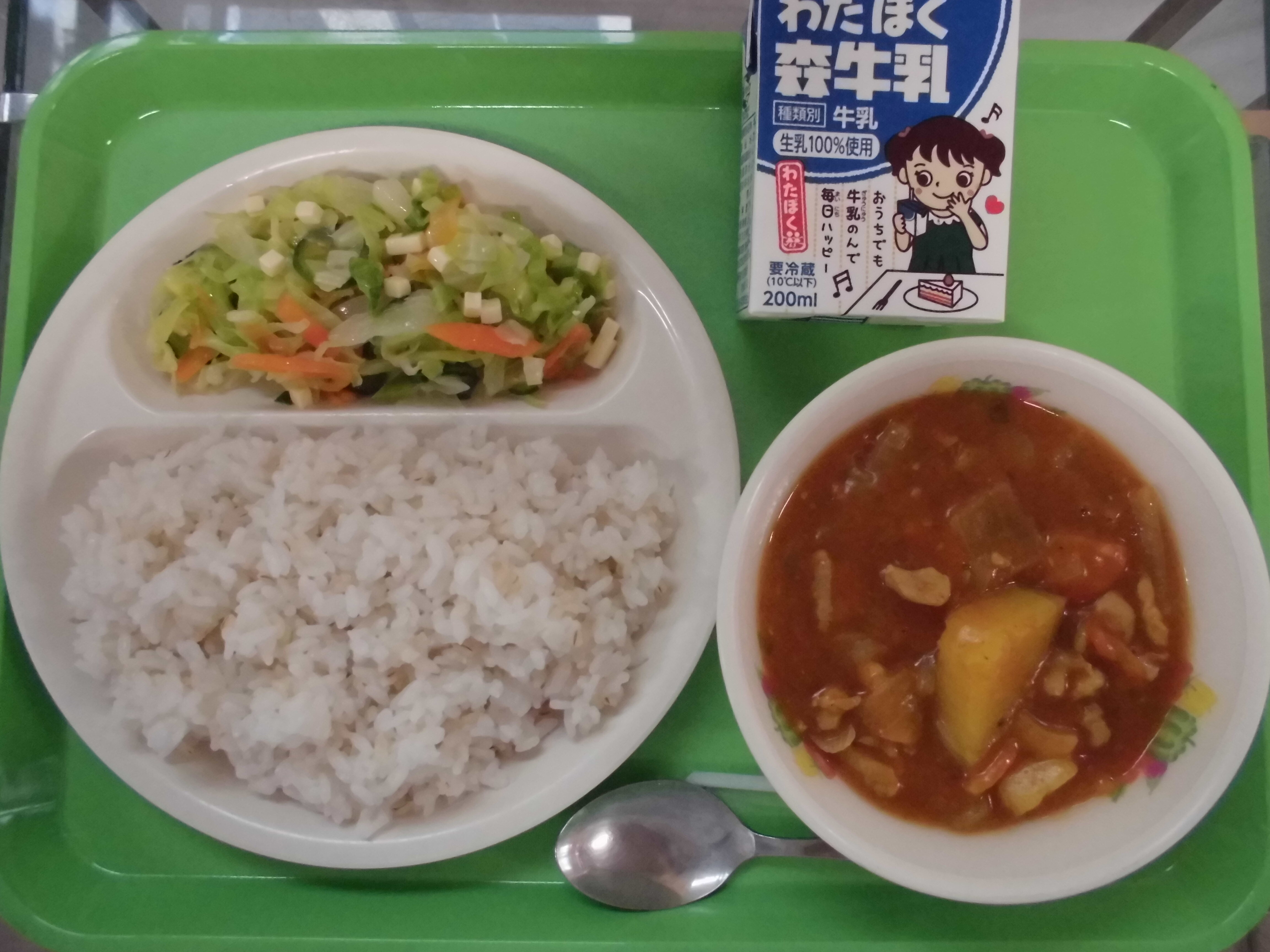 ★今日は、冬野菜がたっぷり入ったカレーです。冬野菜は、冬の寒い気候でも凍らずに耐えるため、甘味やうま味を蓄えている野菜が多いです。今日のカレーには、大根、れんこん、さつまいも、にんじんが入っています。スパイシーなカレーになりましたが、低学年もよく食べてくれました。